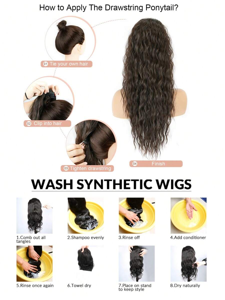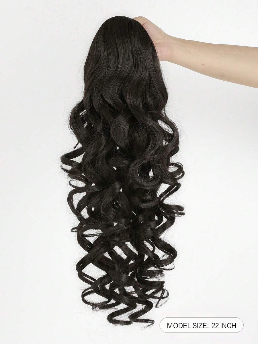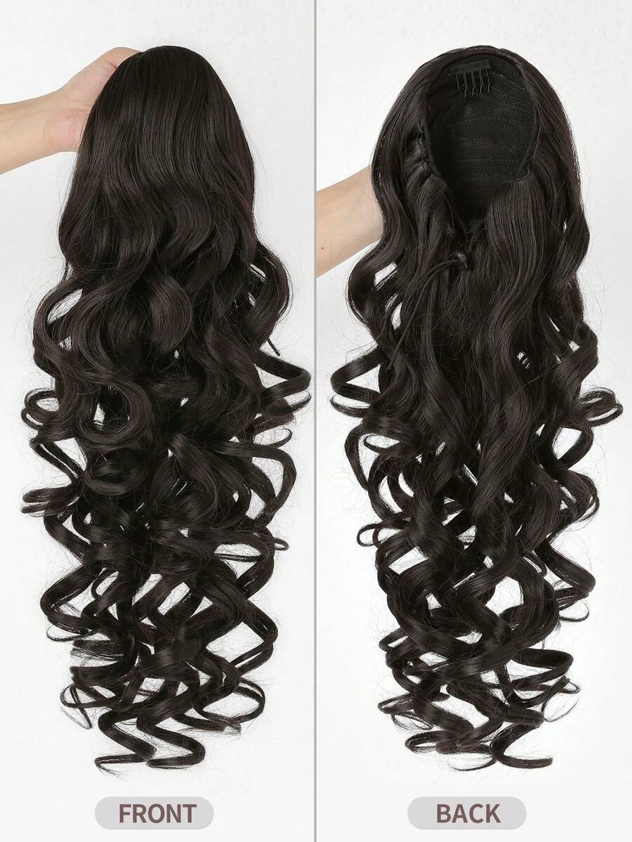 شعر مستعار طويل مموج بطول 22 بوصة، باللون الأسود الطبيعي، مزود بمشبك وسحاب لتثبيت آمن وسهل. مصنوع من ألياف مقاومة للحرارة وحرير مطفي