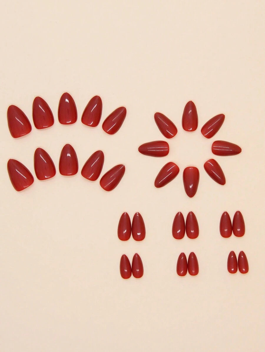 مجموعة فيها 30 قطعة من أظافر صناعية بلون أحمر غامق ولامع، تصميم ناعم وكلاسيكي بشكل لوزي يعكس ذوق أنيق وبسيط. سهل التركيب ويكمل إطلالتك بكل سهولة✨