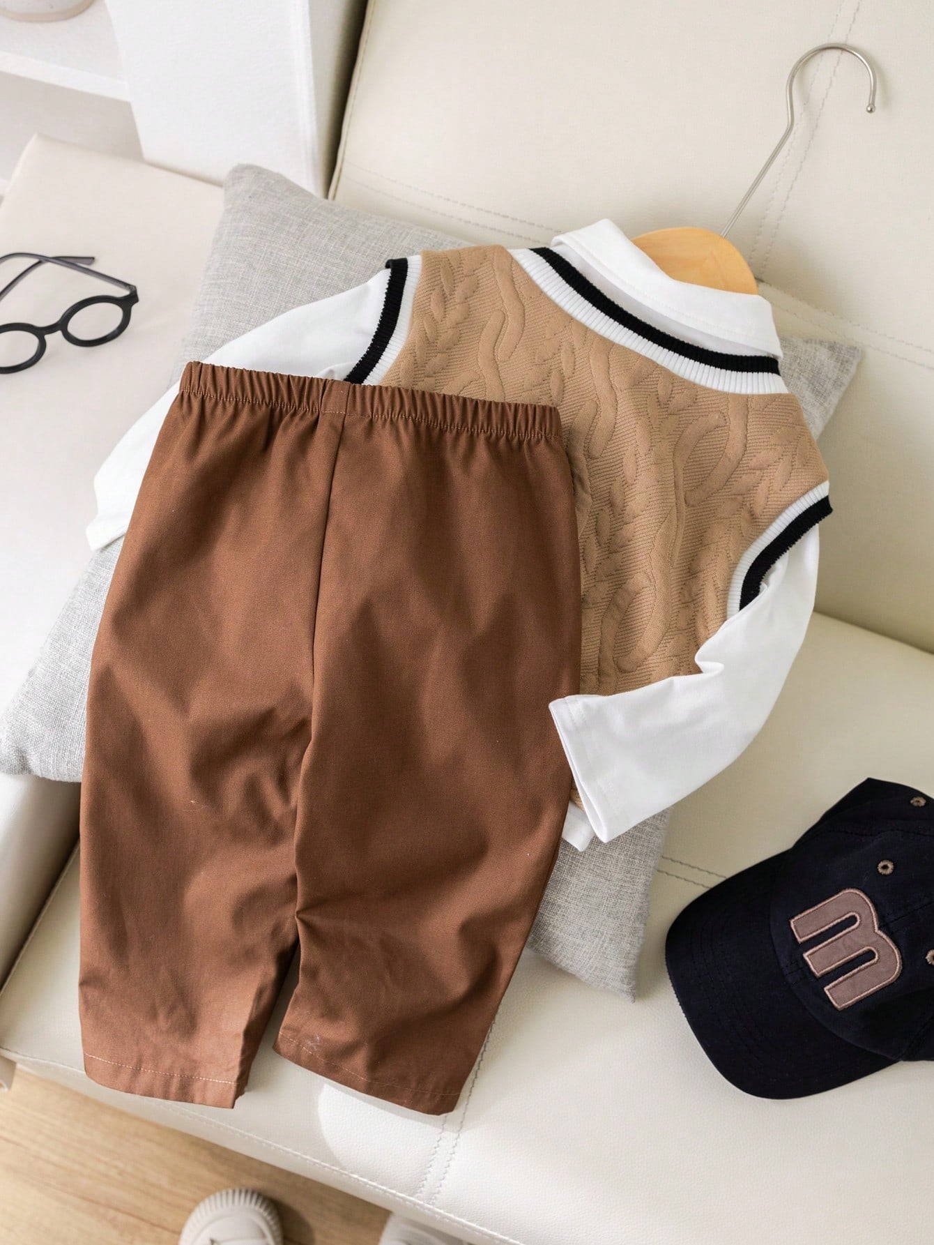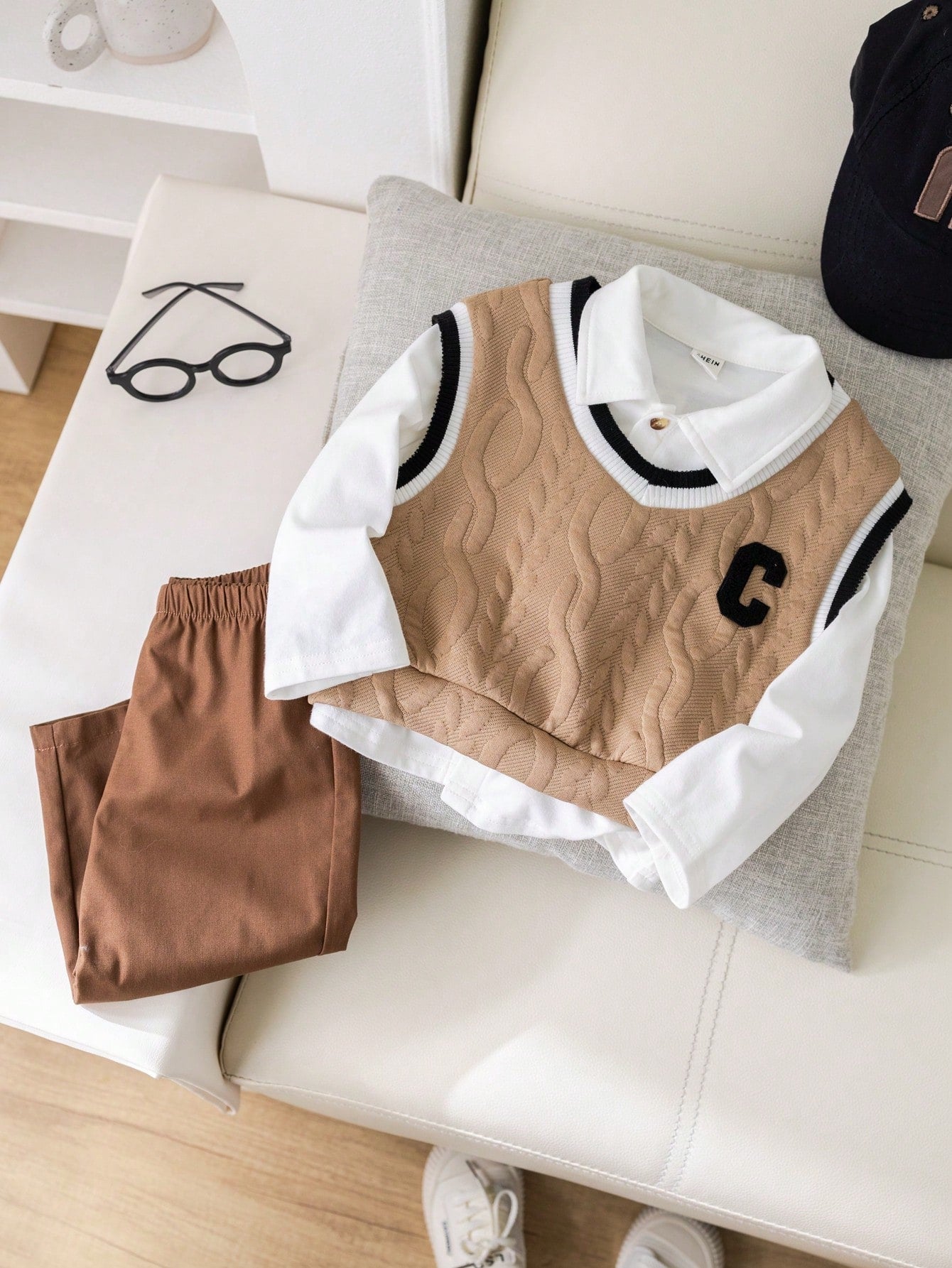 طقم بدلة للأطفال الصبيان عودة إلى المدرسة 3 قطع: سترة كنتراست محبوكة، قميص بأكمام طويلة، بنطلون خاكي كاجوال