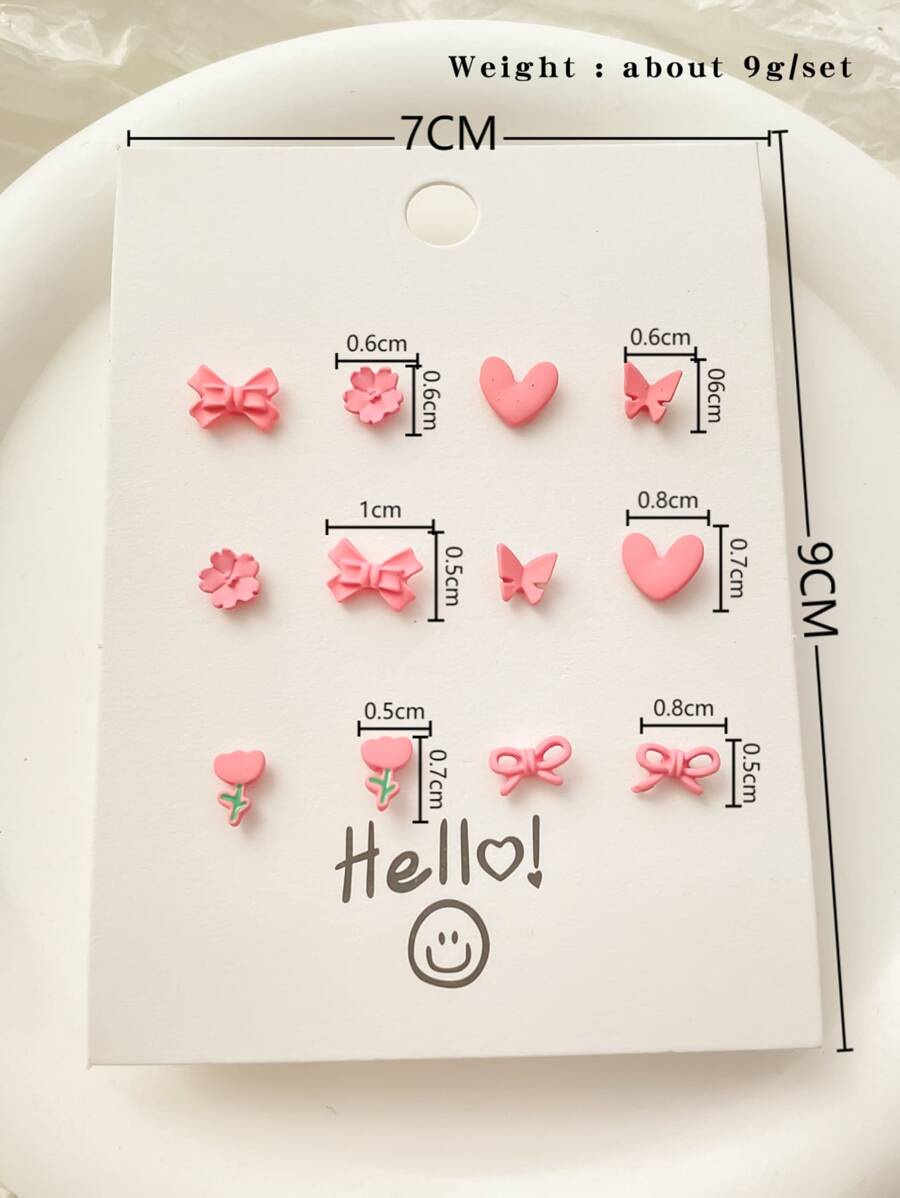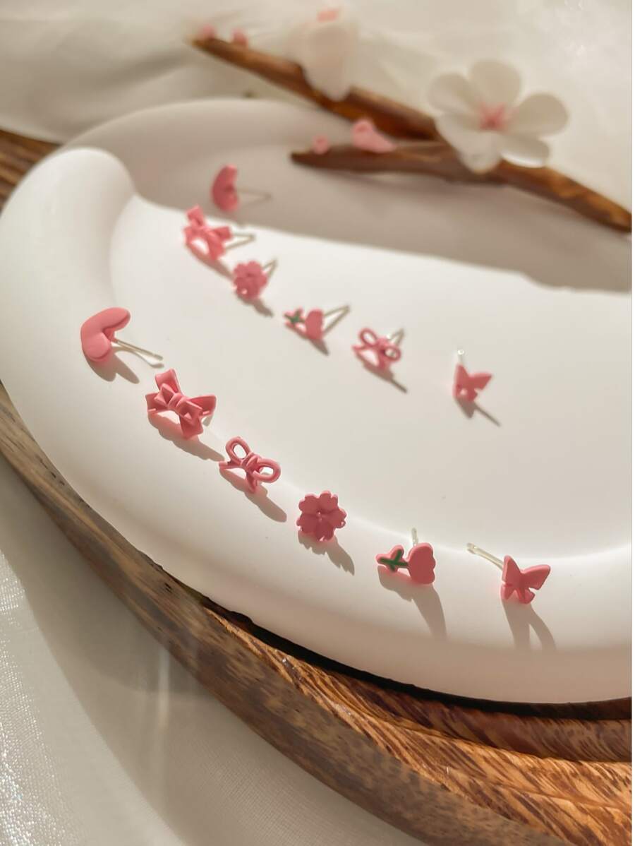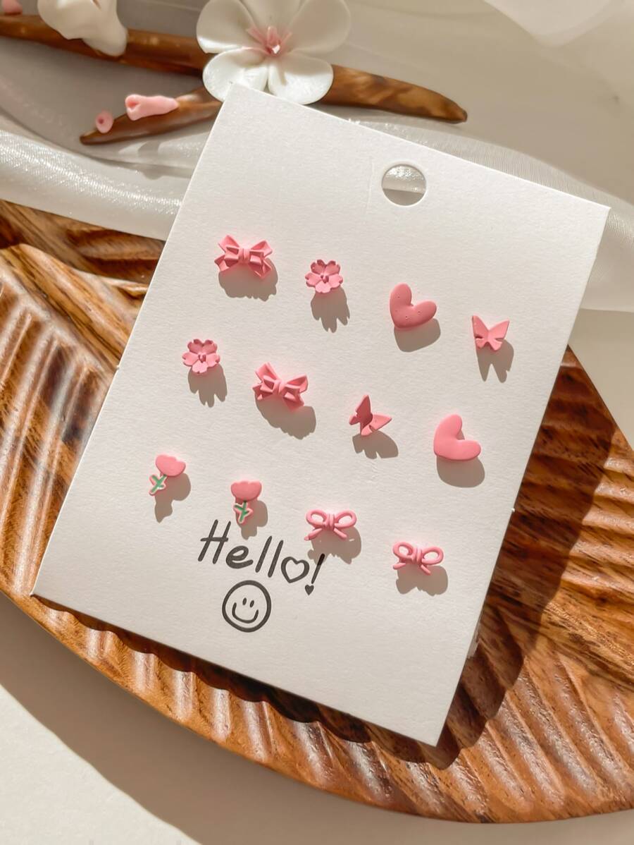 طقم من 12 قطعة من أقراط الأزرار المصغرة بتصاميم أنيقة وبسيطة على شكل زهرة وفراشة باللون الوردي الناعم، يمنحك لمسة أنثوية رقيقة تناسب الاستخدام اليومي والمناسبات الخاصة مثل عيد الحب.