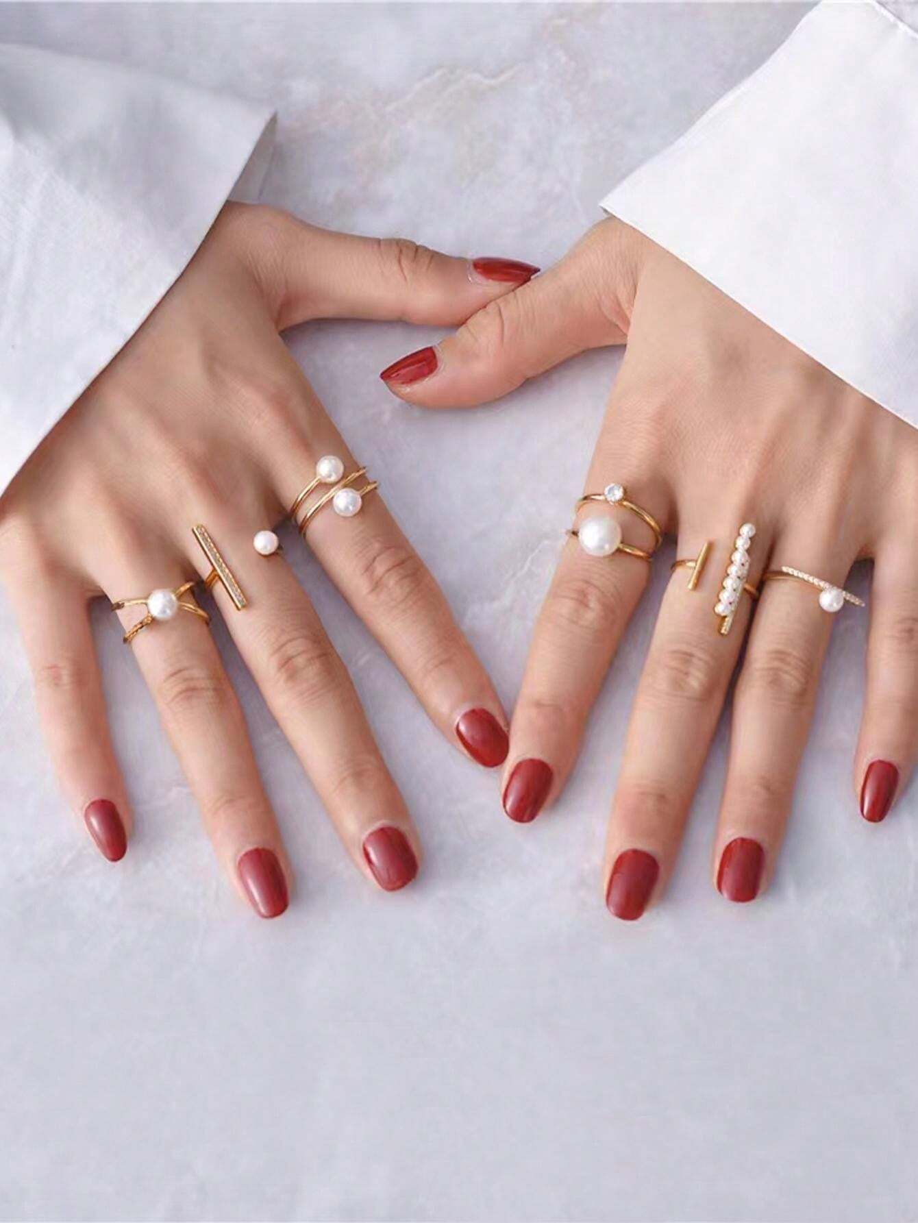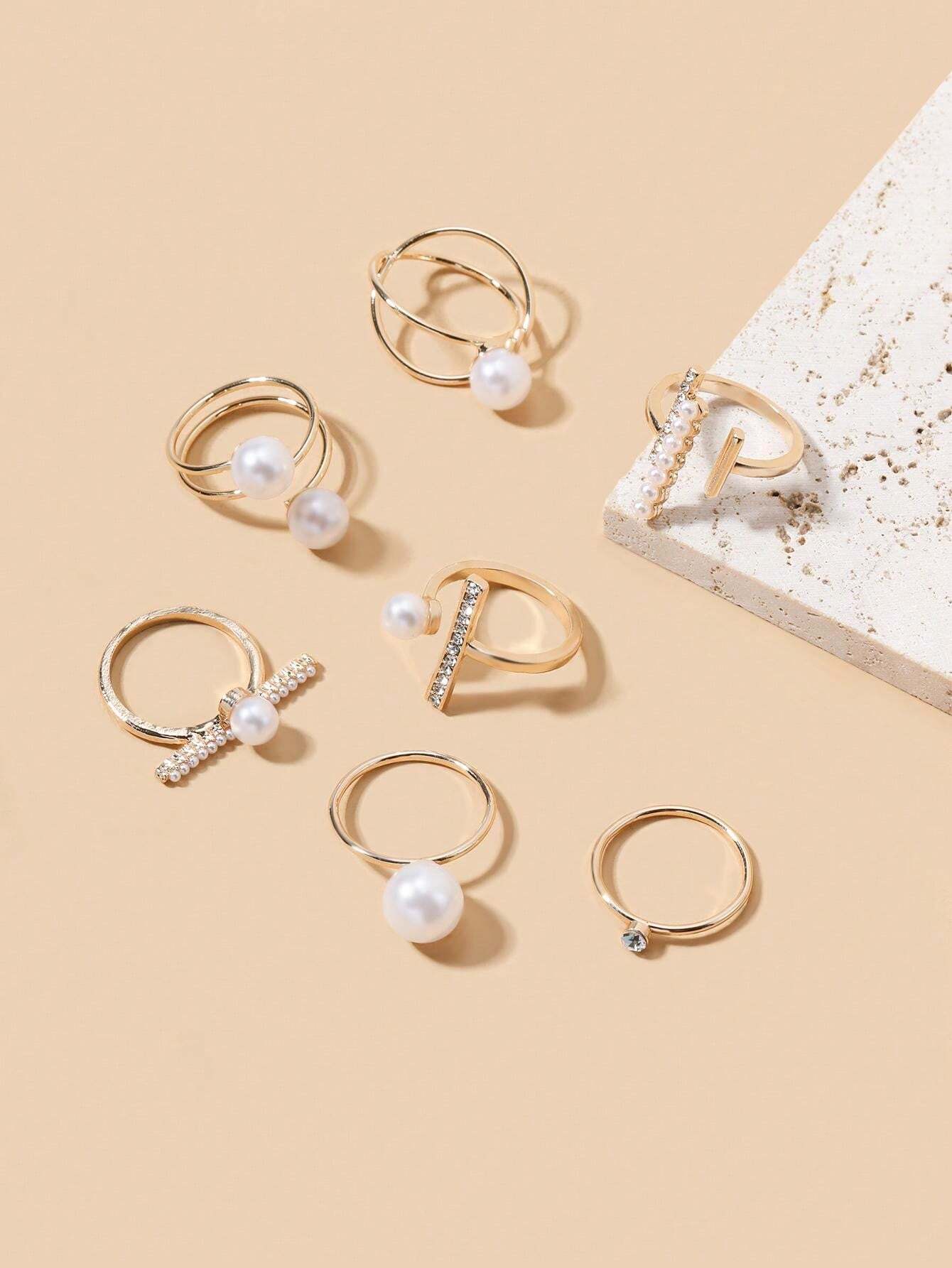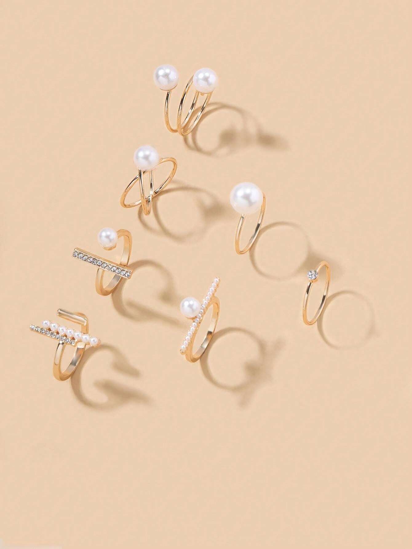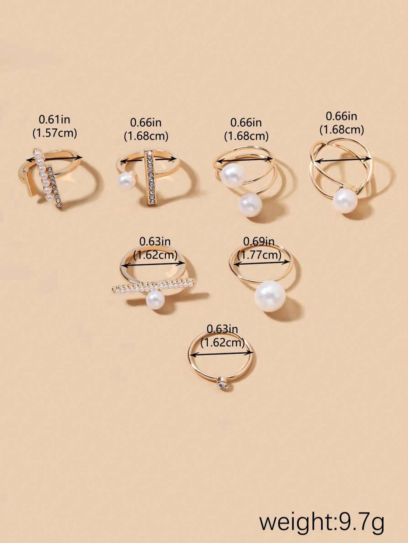 مجموعة من 7 حلقات أنيقة مزينة باللؤلؤ الاصطناعي وحجر الراين، مناسبة للارتداء اليومي والمناسبات الخاصة.