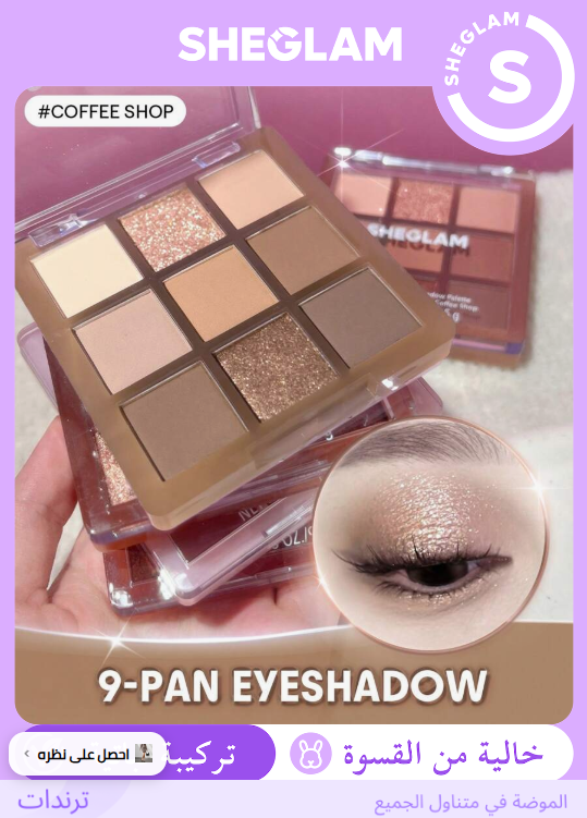 باليت بـ9 درجات مستوحاة من نكهات القهوة، من البيج الدافي للموكا والبني الغامق، كلها بألوان لامعة تعطي لمعة ناعمة وجذابة. التركيبة بودرة مضغوطة تنمزج بسهولة وتعطي لوك طبيعي وراقي، مناسب لمحبات النود ✨