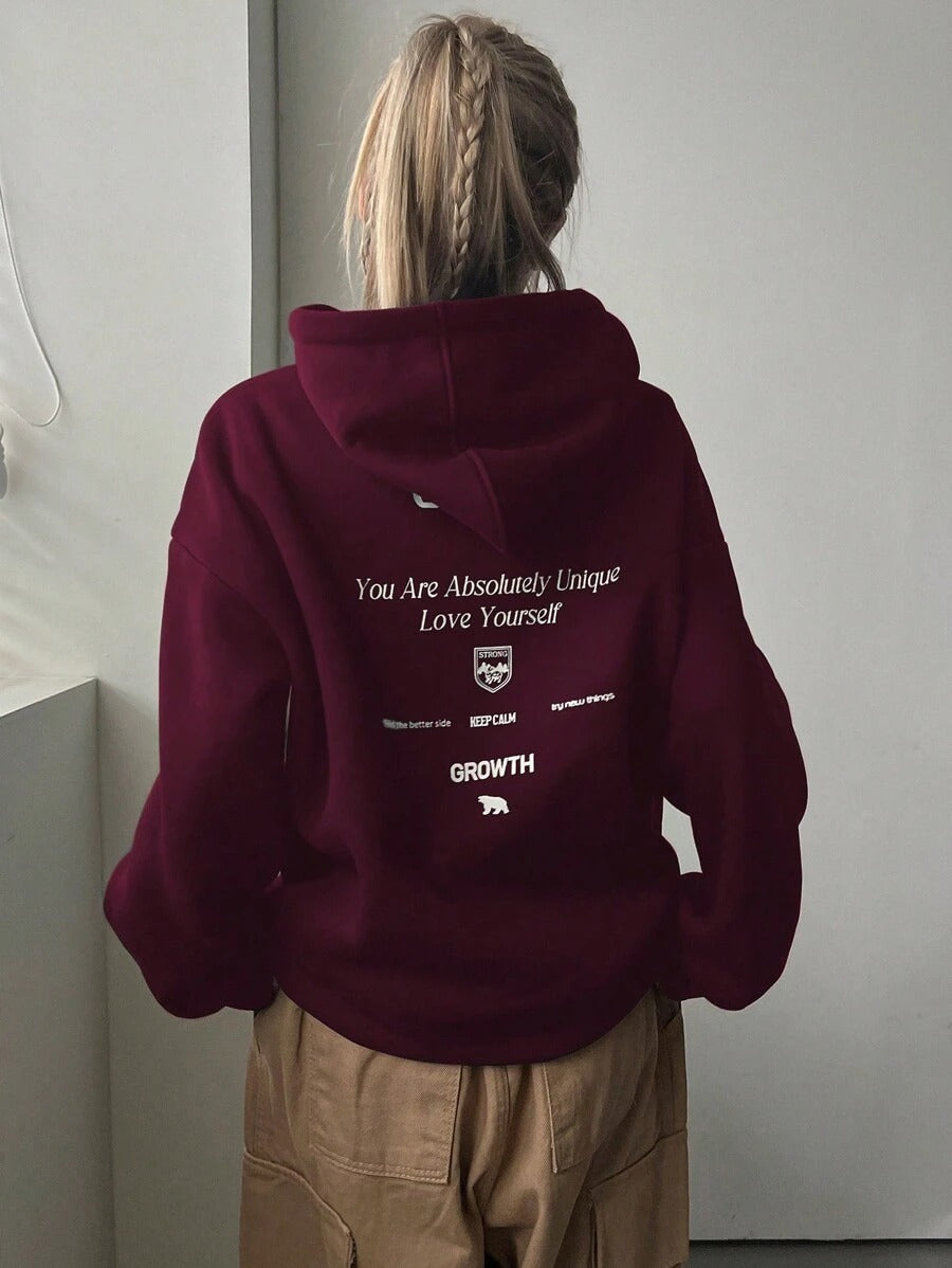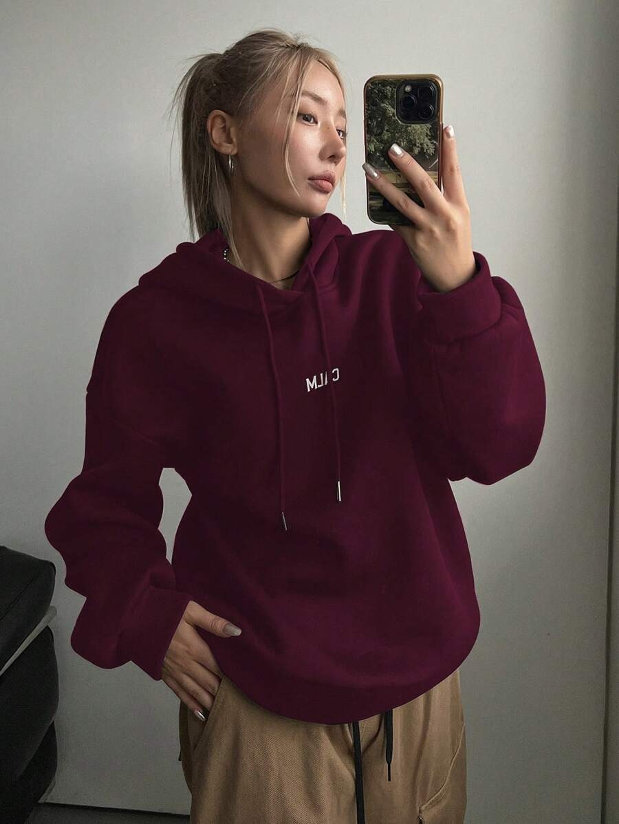 🧥🍷 qualityDAZY بلوزة هودي نسائية طويلة مطبوعة على الظهر – لون عنابي