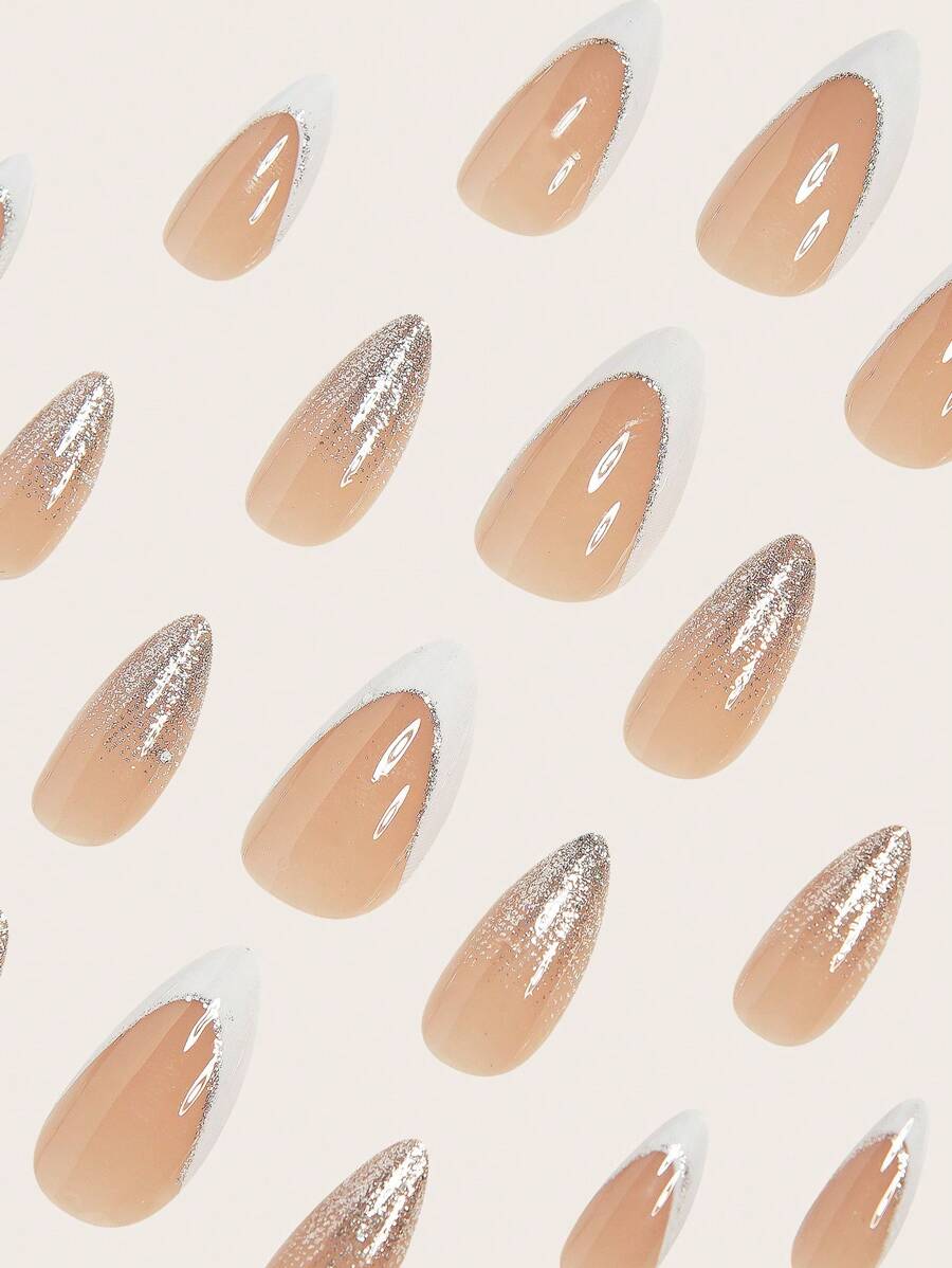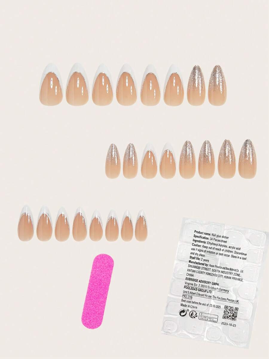 طقم فيه 24 قطعة من الأظافر الصناعية بشكل لوزي، لون أبيض بتصميم فرنسي ناعم وخطوط لامعة عصرية 🤍