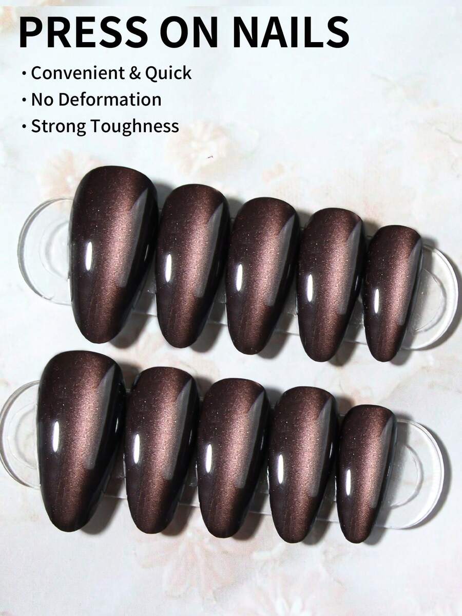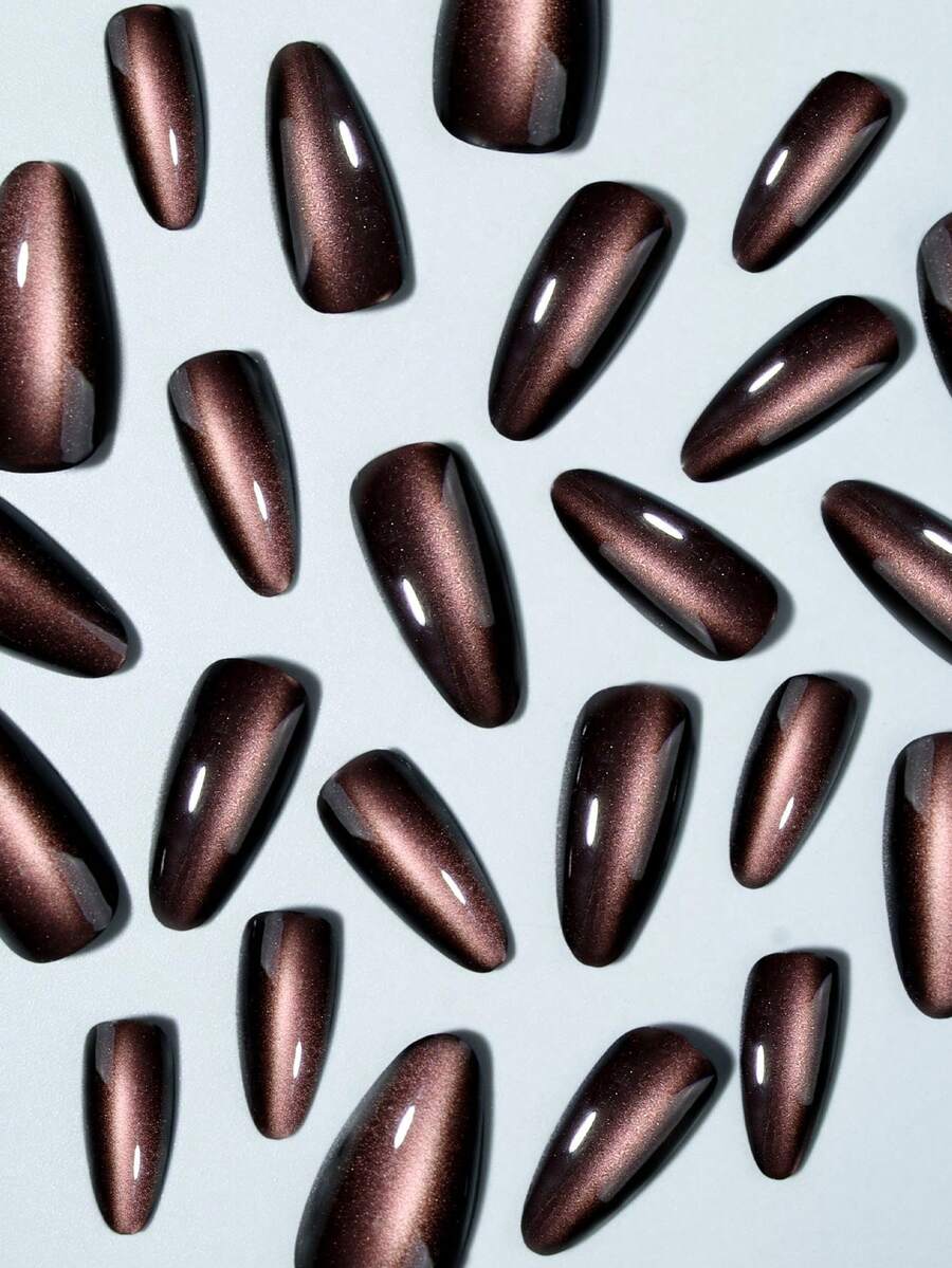 SHEIN أظافر 24 قطعة بشكل لوز طويل بتصميم عين القطة بلون بني