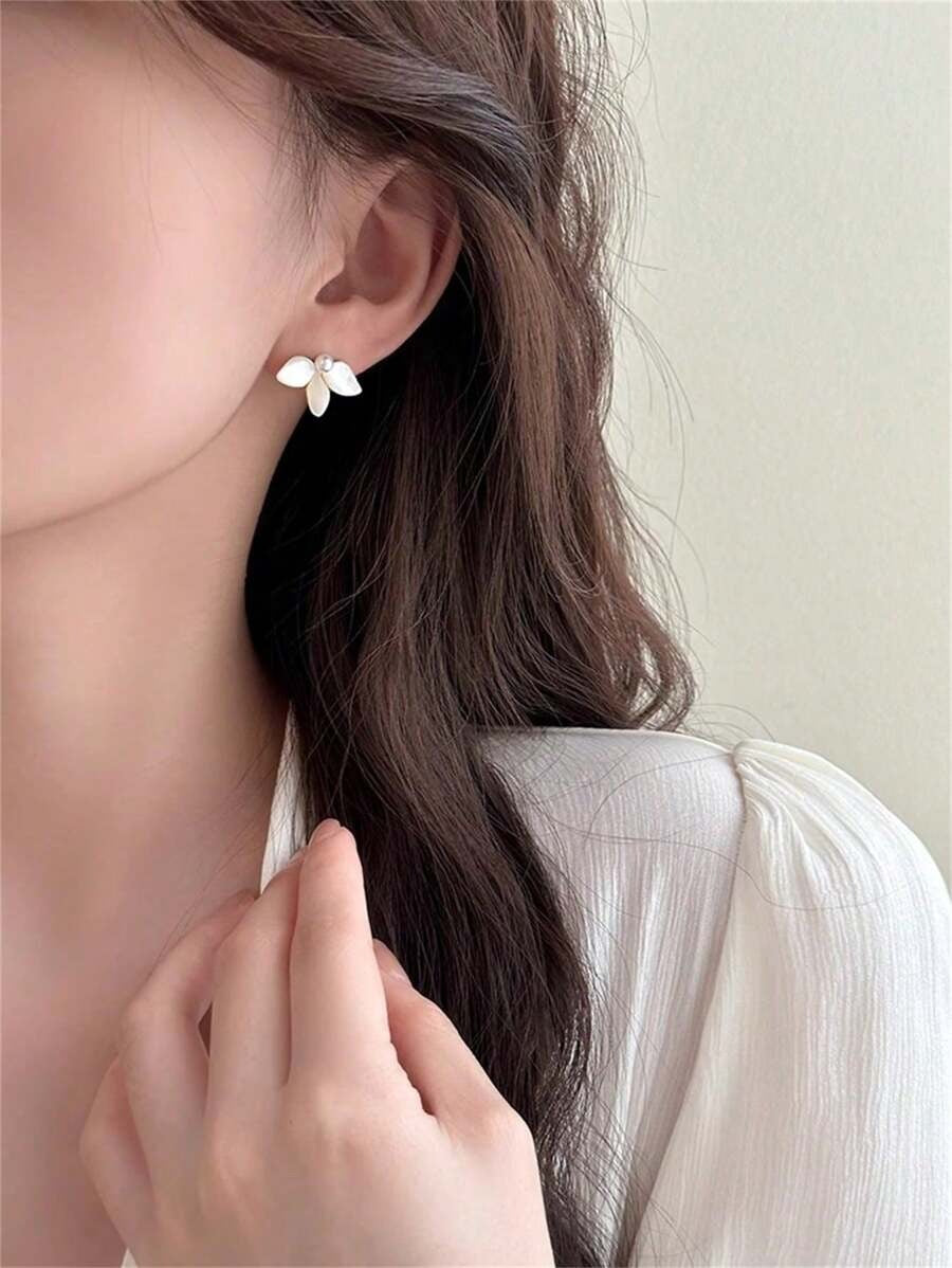 SHEIN أقراط أزرار بيضاء بزهرة وخرز لؤلؤ