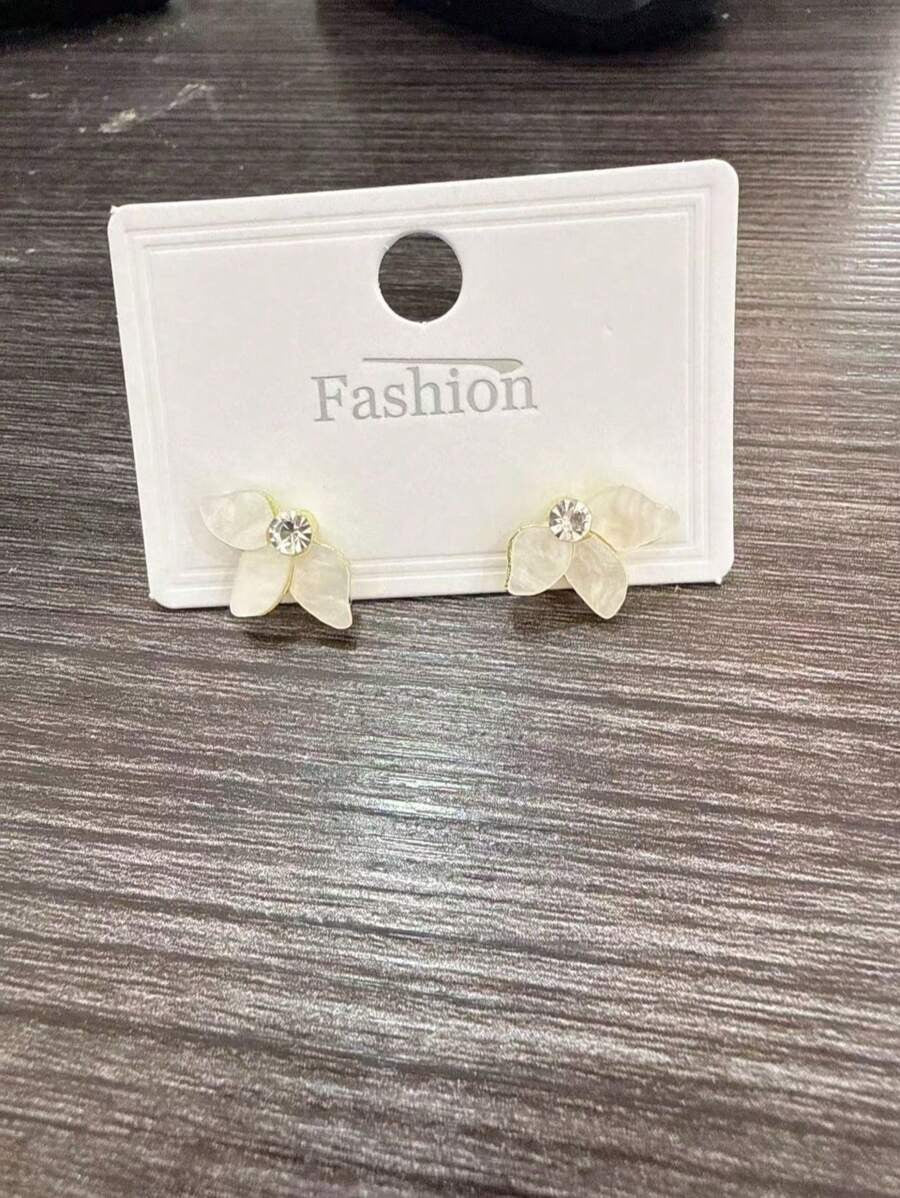 زوج من أقراط الأزرار مزينة بزهرة صغيرة وخرزة لؤلؤ صناعي، تصميم بسيط وناعم يضيف لمسة أنثوية خفيفة للإطلالة.