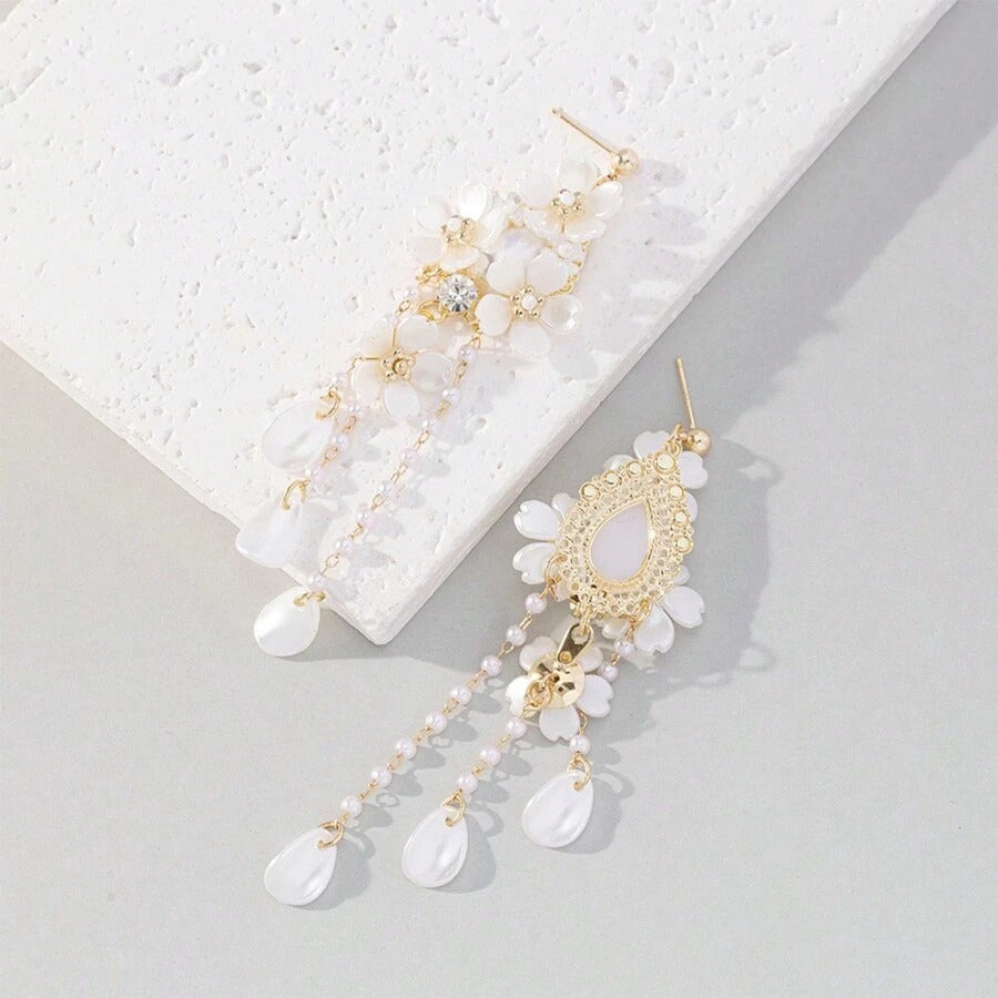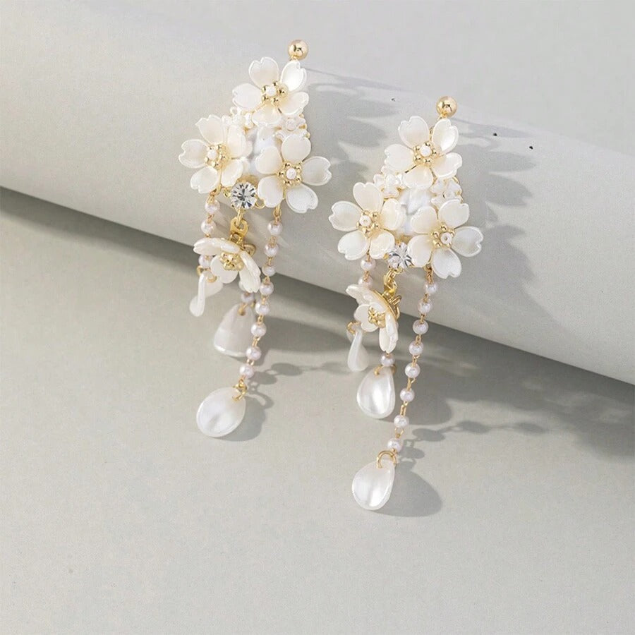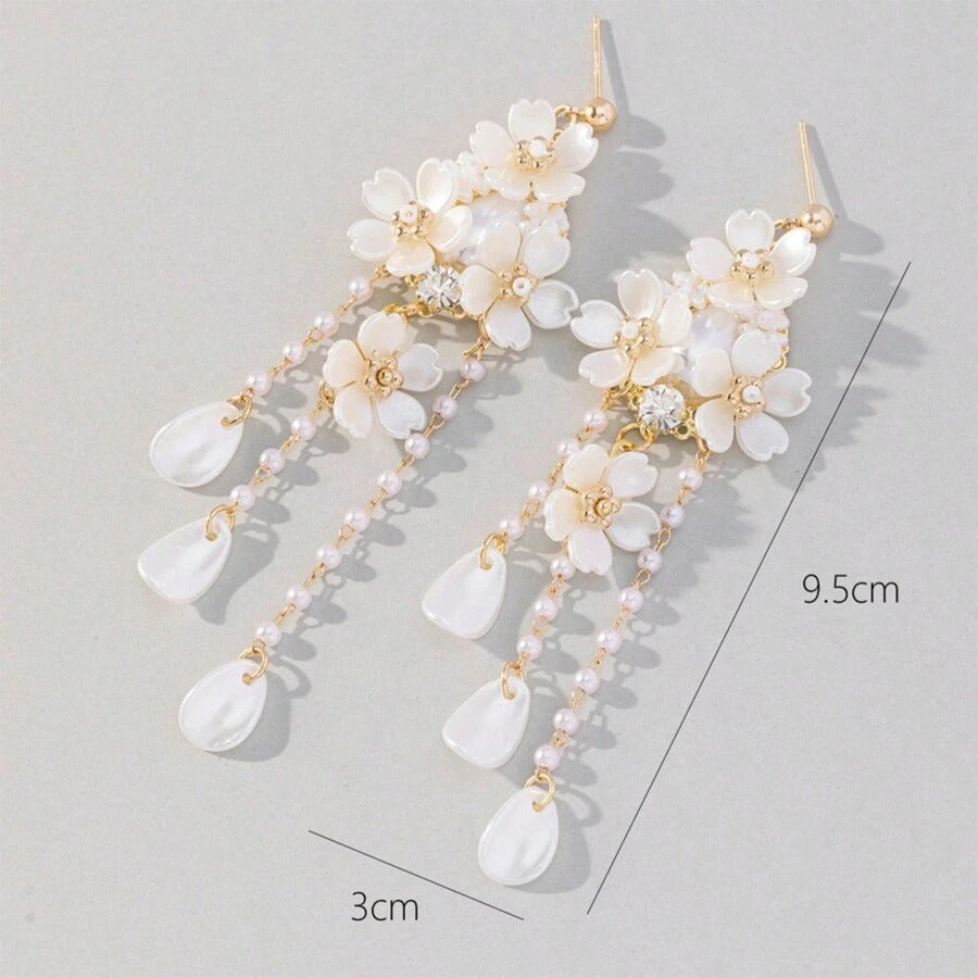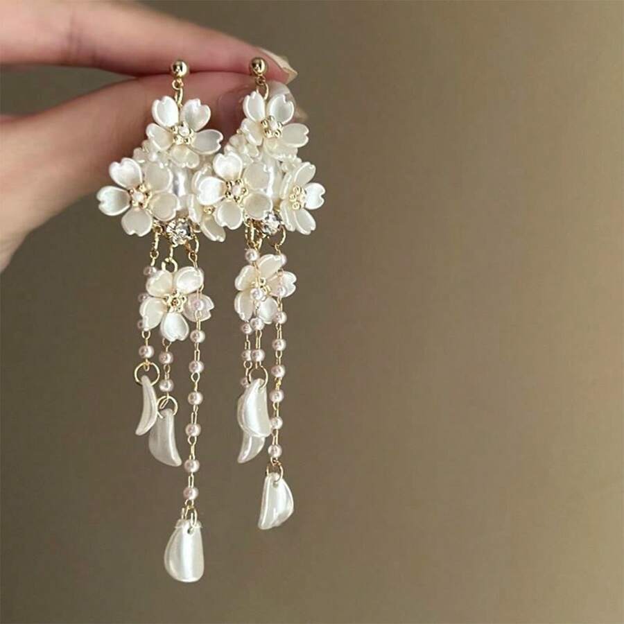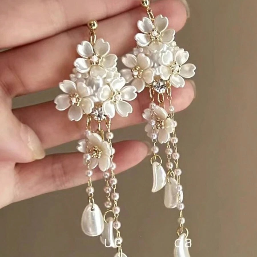 أقراط حلقة طويلة مزينة بكاميليا وقطرة لؤلؤ – لمسة أنثوية راقية 🌸🤍