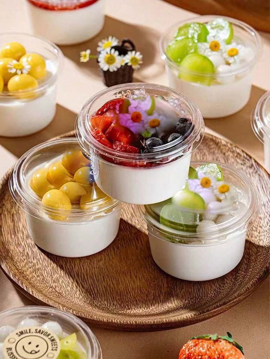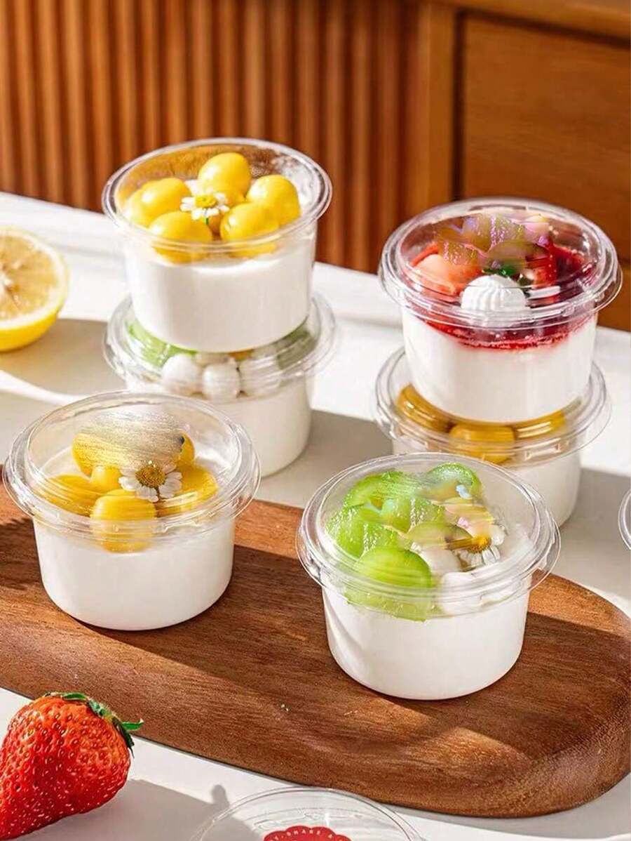 علب كريمة مزدوجة صغيرة متعددة الاستخدامات، مثالية لليوغرت، الآيس كريم، وأطباق الحلوى، مزودة بأغطية لحفظ الطعام بشكل آمن ومنع التسرب. تصميم عملي وجاهز للحفلات والوجبات اليومية.
