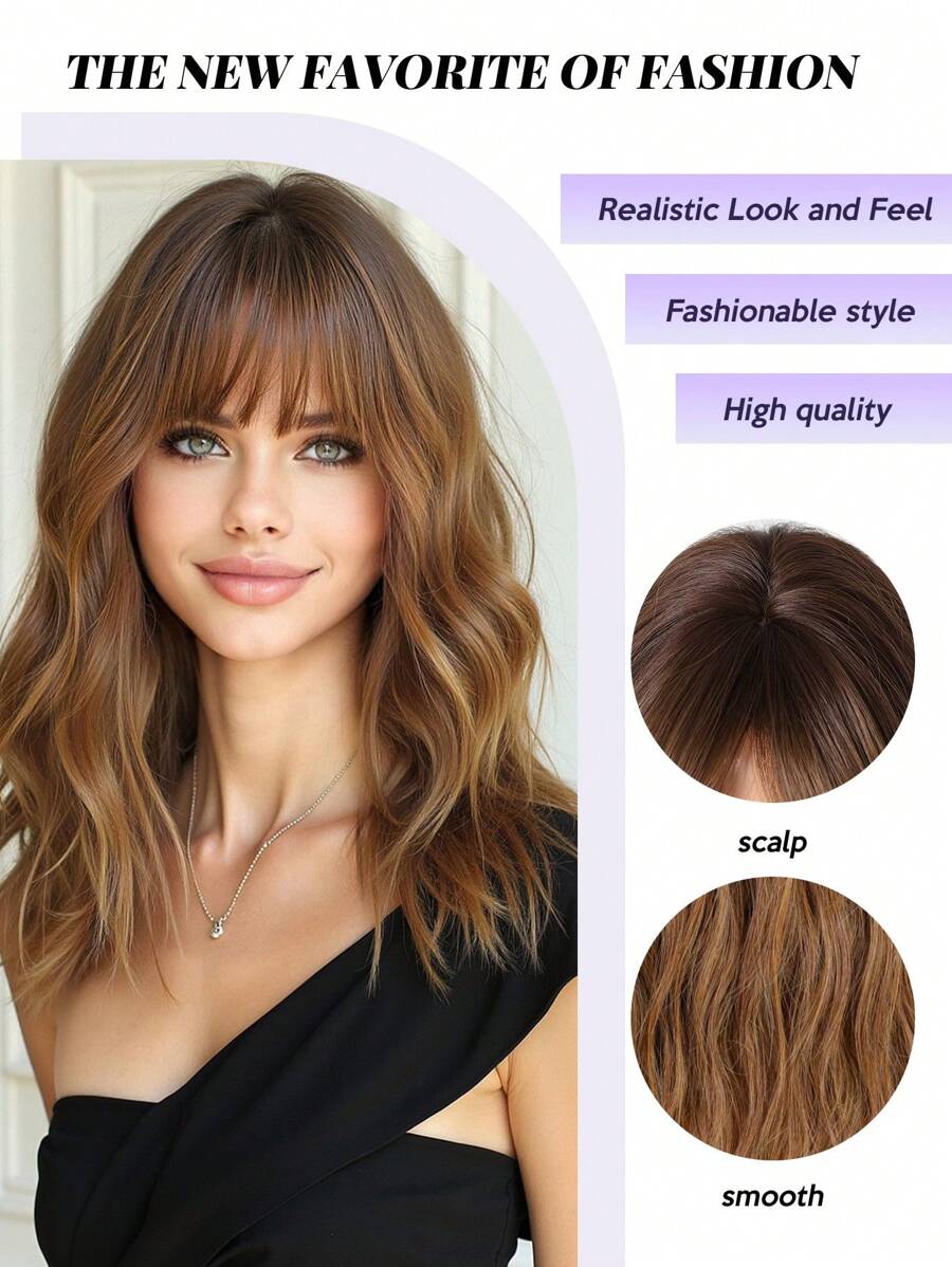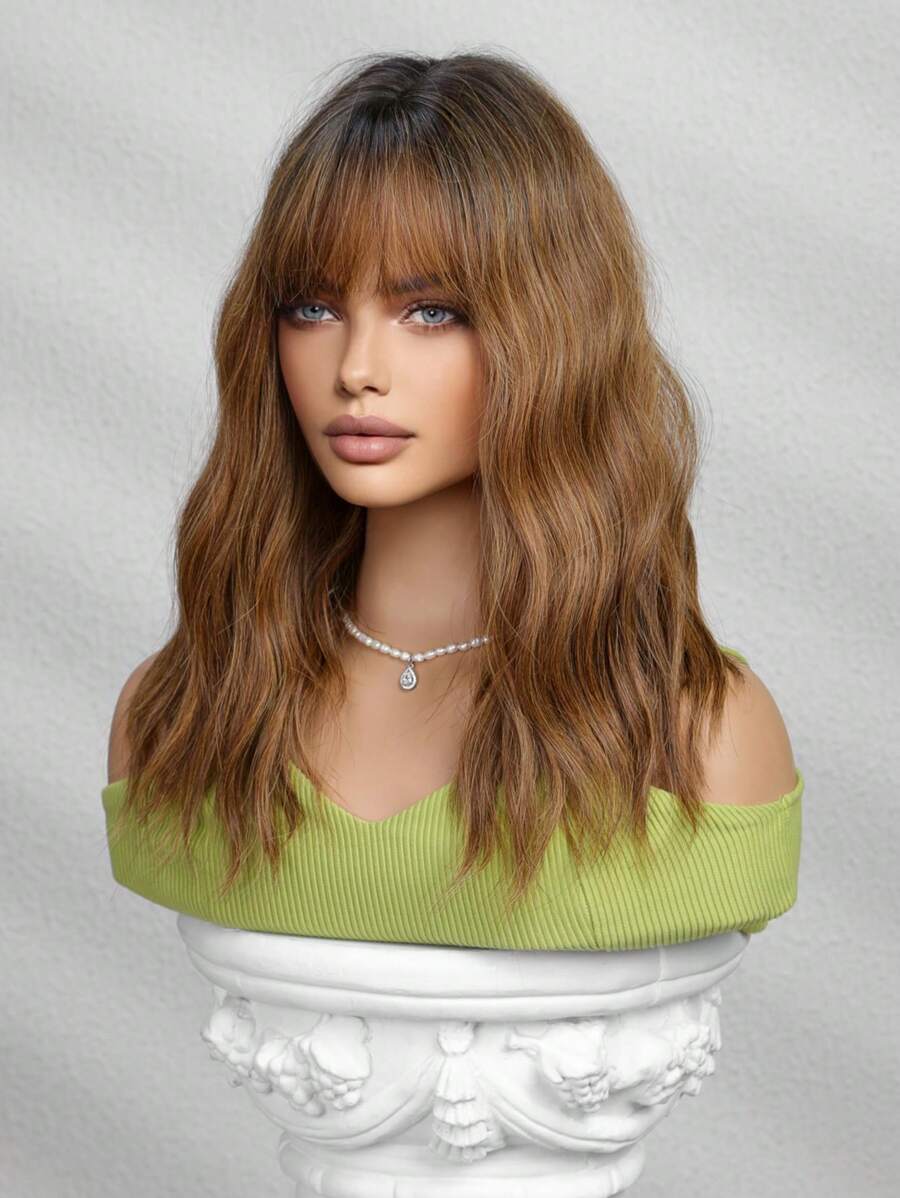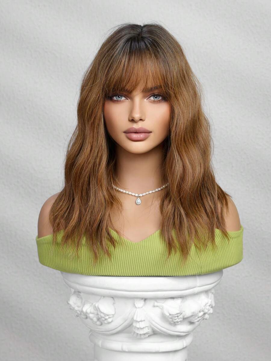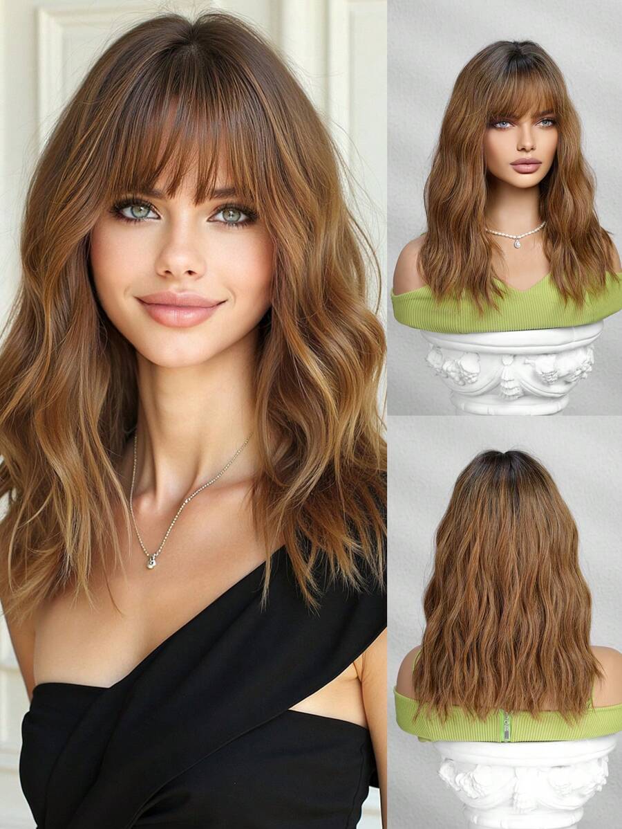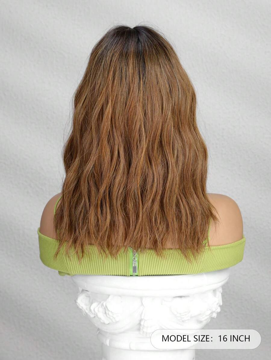 SHEIN باروكة بني 16 بوصة تموجات طبيعية مجعد مع غرة ألياف صناعية