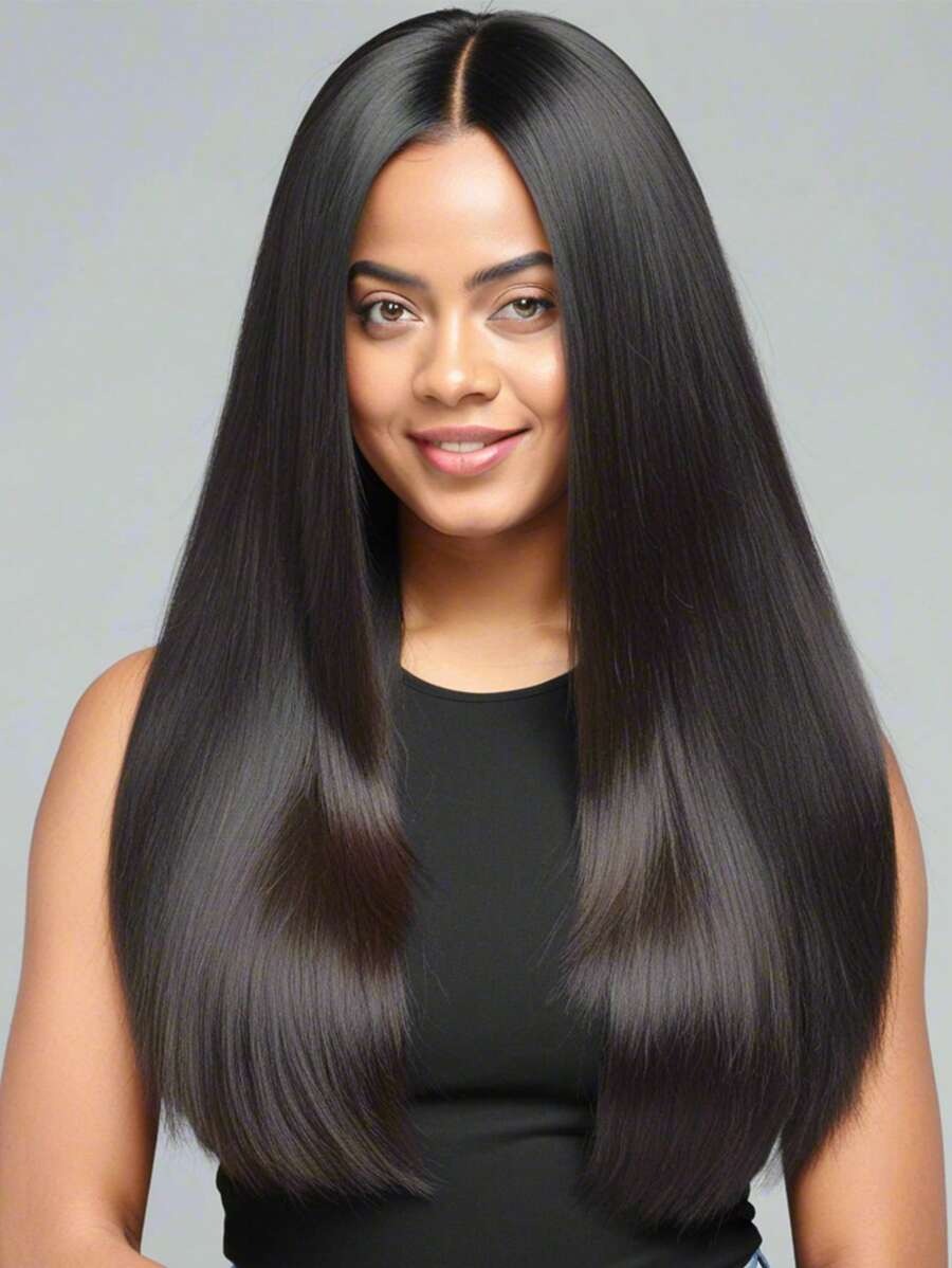 باروكة شعر ناعمة ومظهرها طبيعي، بطول متوسط يوصل لـ٢٨ بوصة، بلون أسود وفرق من النص. تصميمها أنيق وكثيف، بدون خصل أمامية، وتجي بقبعة شبكية مريحة فيها أزرار للتثبيت. مقاومة للحرارة وتتحمل التصفيف حتى ١٥٠ درجة، تدوم طويلاً وتعطي إحساس طبيعي.