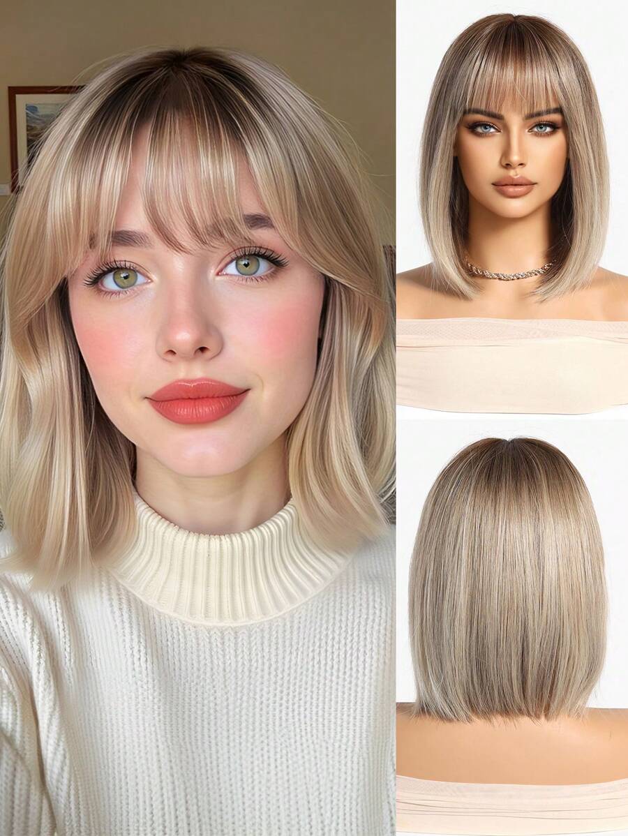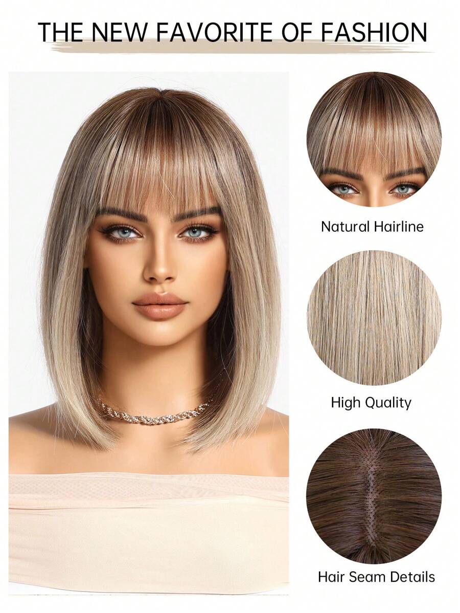 💇♀️✨ باروكة شعر قصير مستقيم – تدرجات بني وأسود وأشقر للسيدات 🌰⚫✨