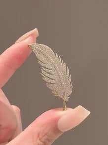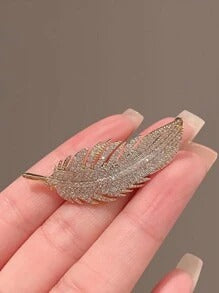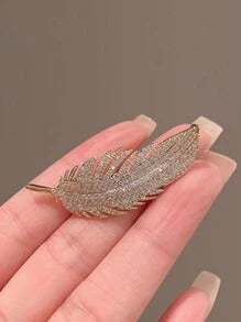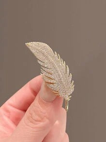 بروش أنيق بشكل ريشة، مزين بالكامل بحجر الراين اللامع، يعطي لمسة راقية ومميزة. تصميمه خفيف وفخم، يلبق على الياقة أو كدبوس بسيط مع البدلات.