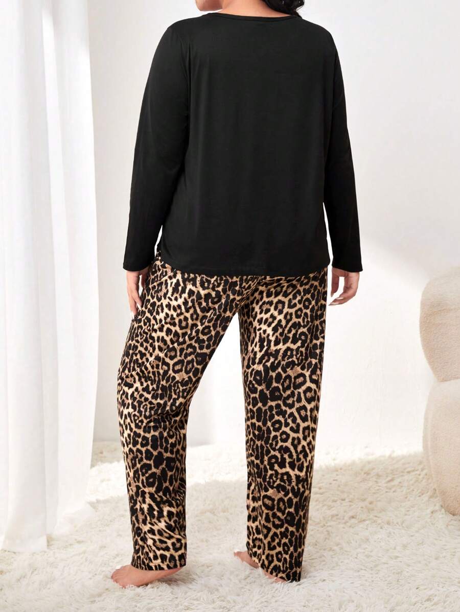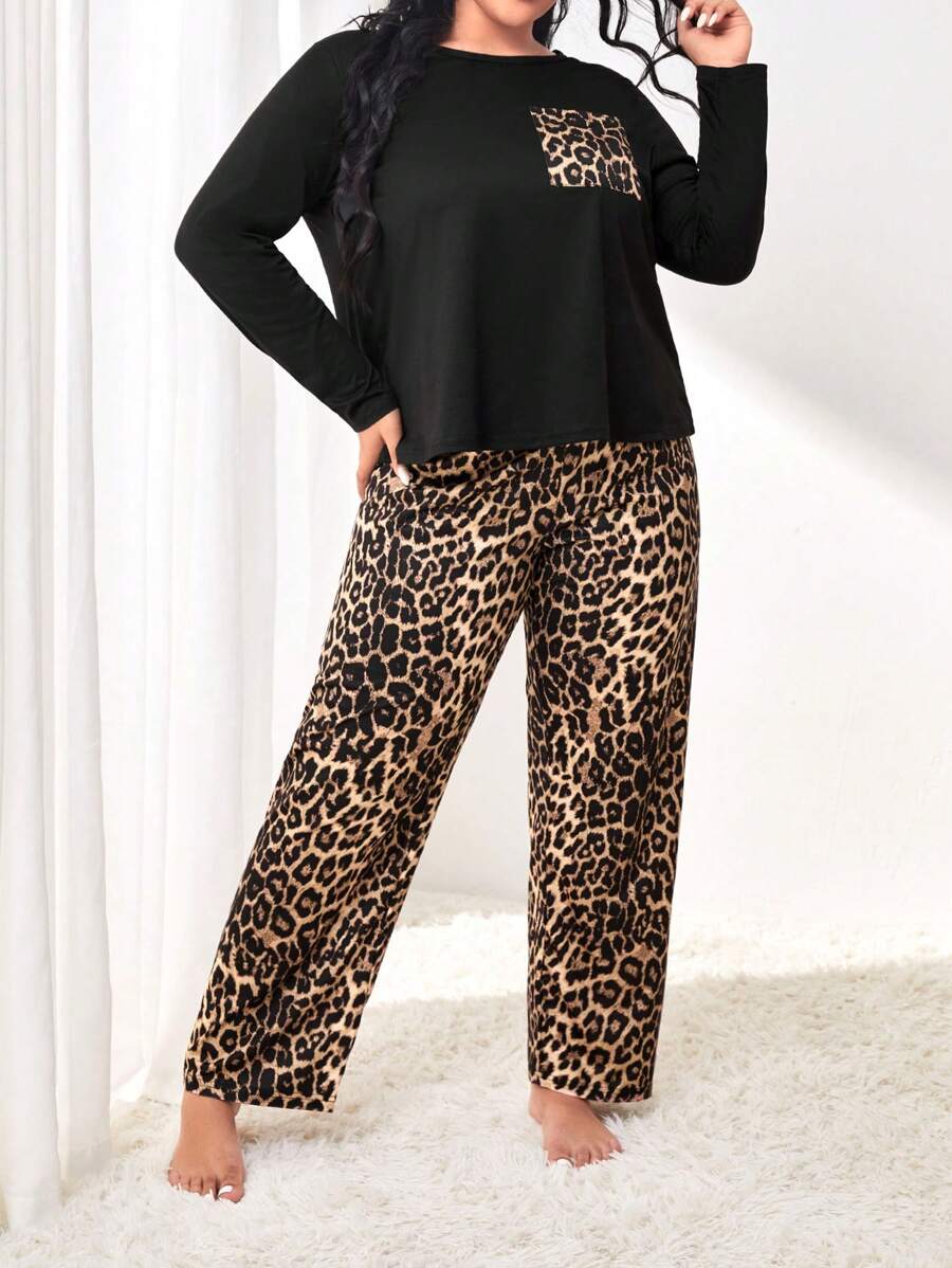 بدلة بيجاما مقاس كبير تتكون من بلوزة بأكمام طويلة وبنطال مطبوع بنقشة النمر مع جيب مرقع، ملابس خريفية مريحة وأنيقة.
