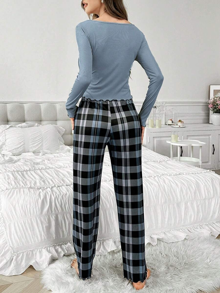 طقم بيجامة أنيق وناعم، يتكوّن من توب ضيق بنسيج مضلع بلون موحّد وبأكمام طويلة، مع بنطال طويل بنقشة مربعات كلاسيكية. فيه تفاصيل زينة بسيطة وزر أمامي يضيف لمسة مرتبة، والخامة مريحة بمرونة متوسطة.