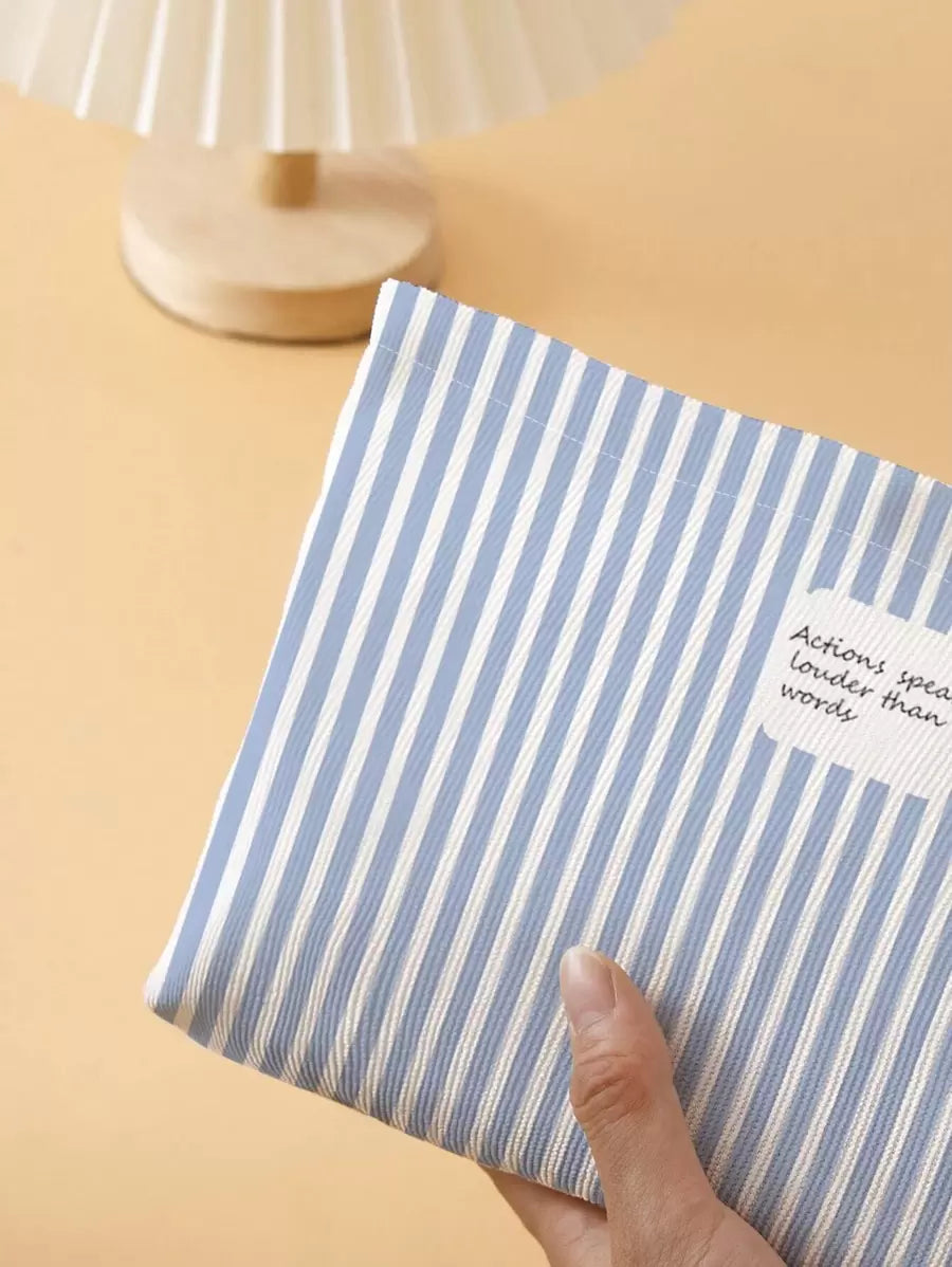🌸 حقيبة مستحضرات التجميل بنمط مخطط – أزرق وأبيض