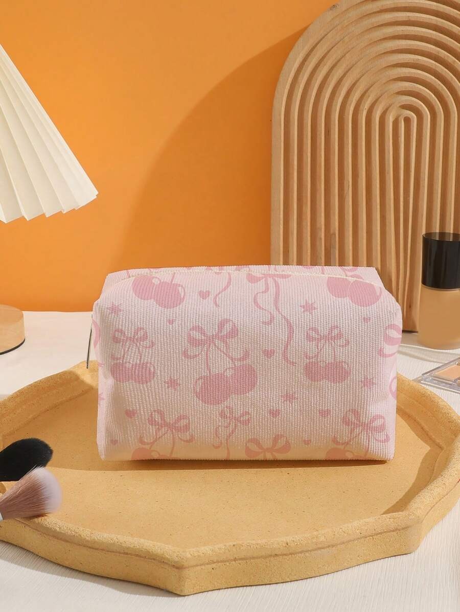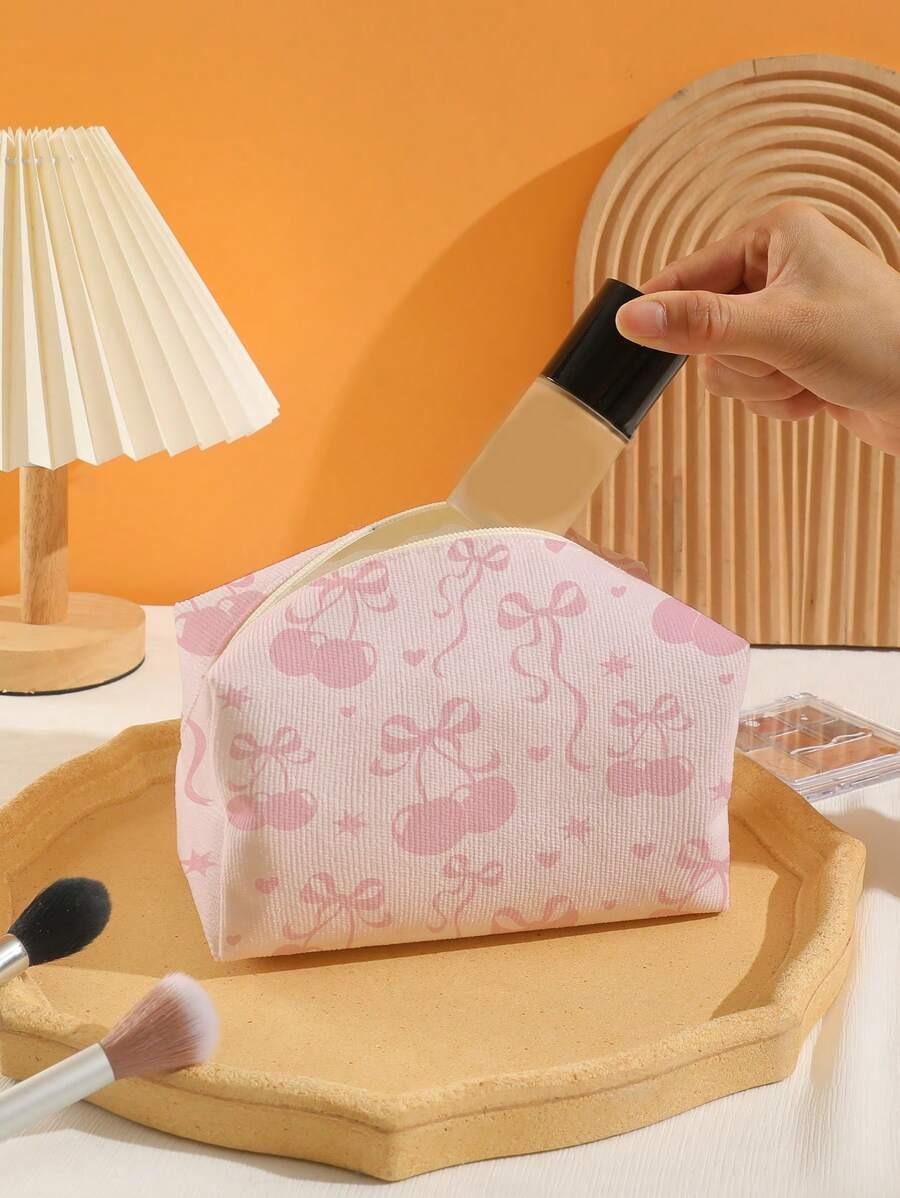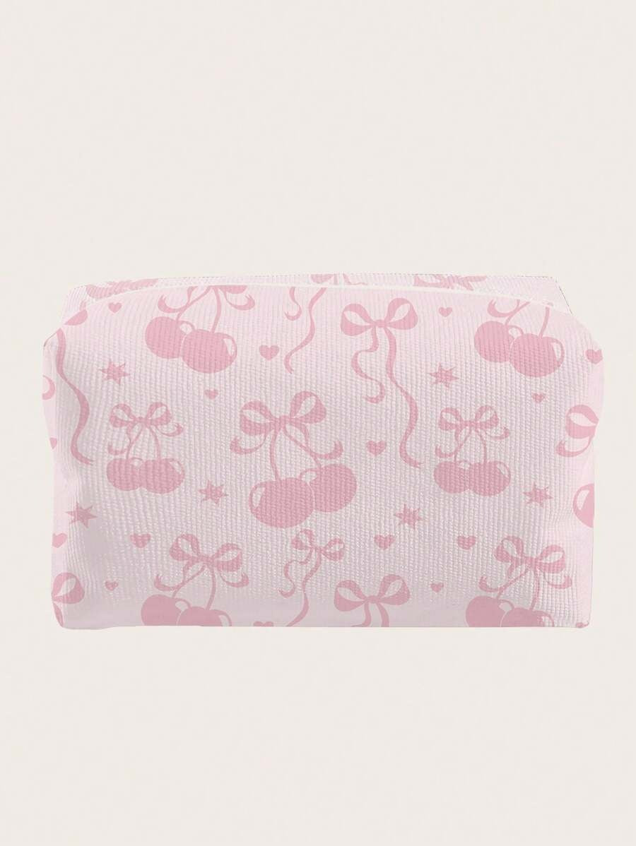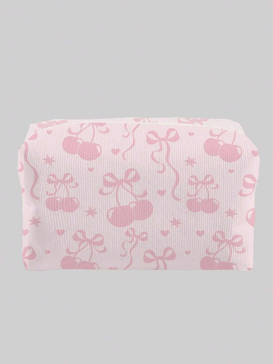 🍒 حقيبة مستحضرات تجميل من الفلانيل بنمط كرز وعقدة فراشة 🎀