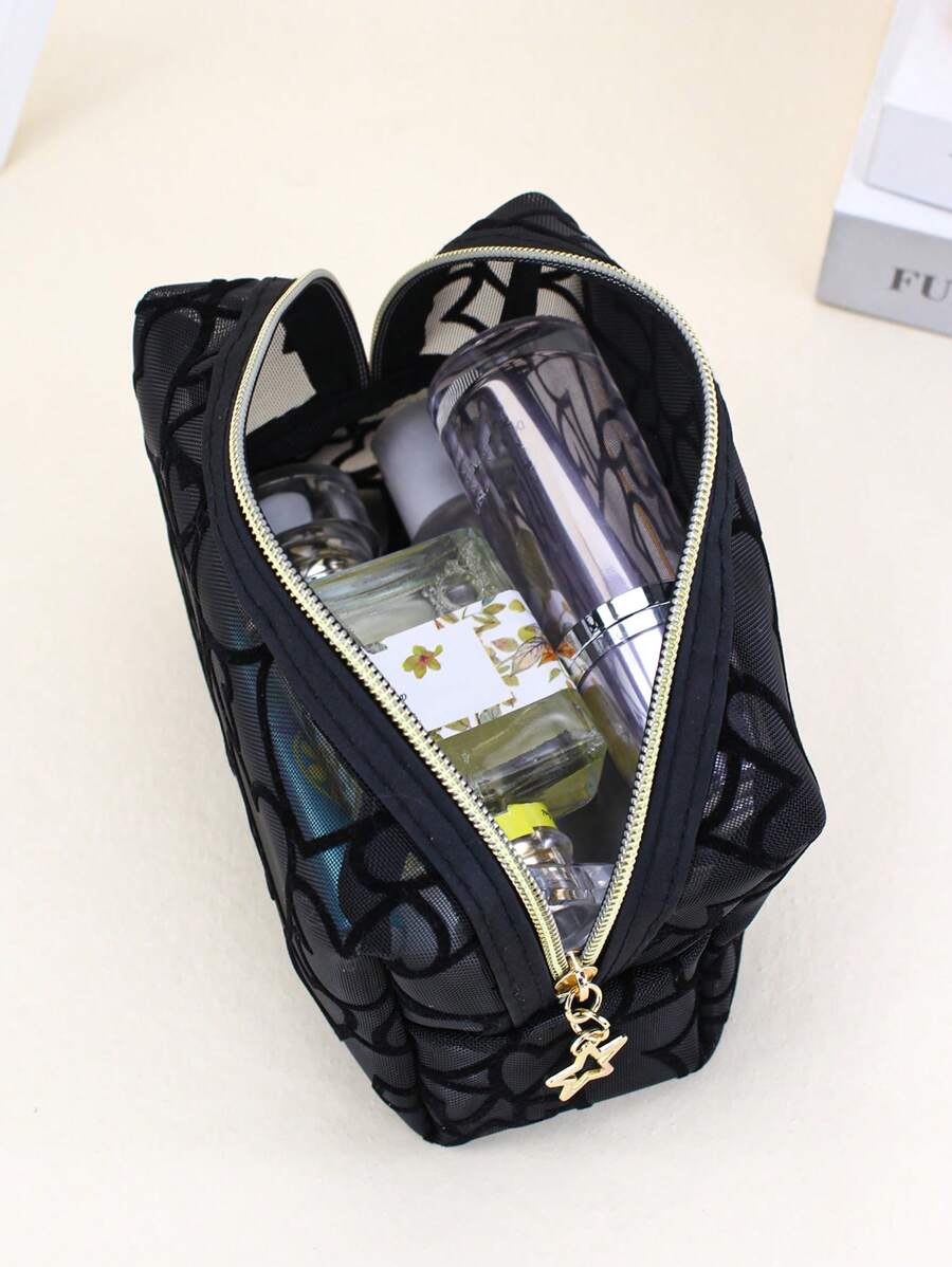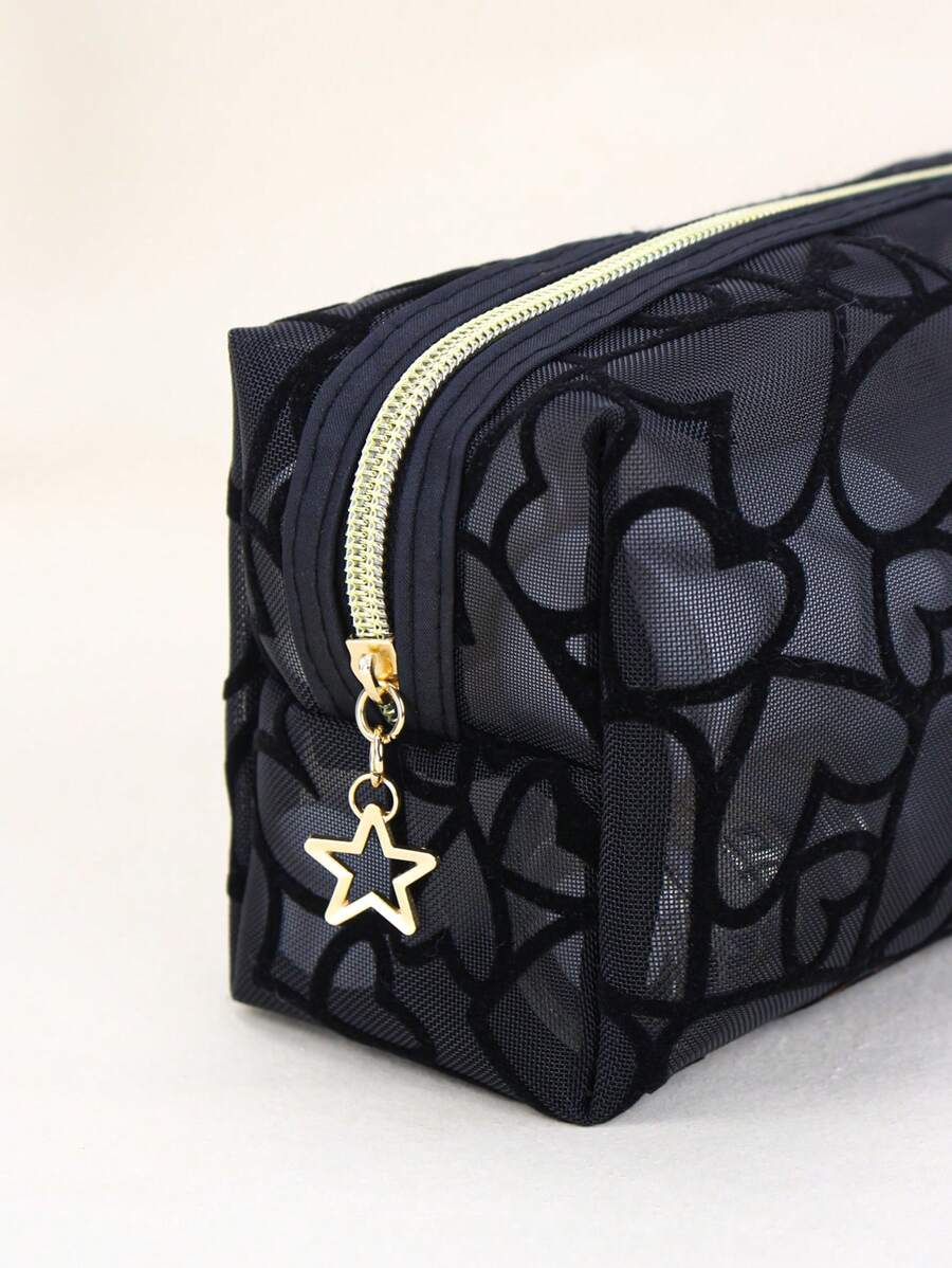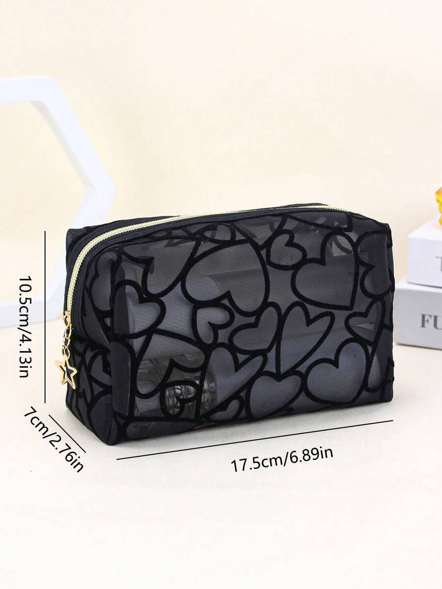 SHEIN حقيبة مكياج سوداء شبكية مزينة بالقلب