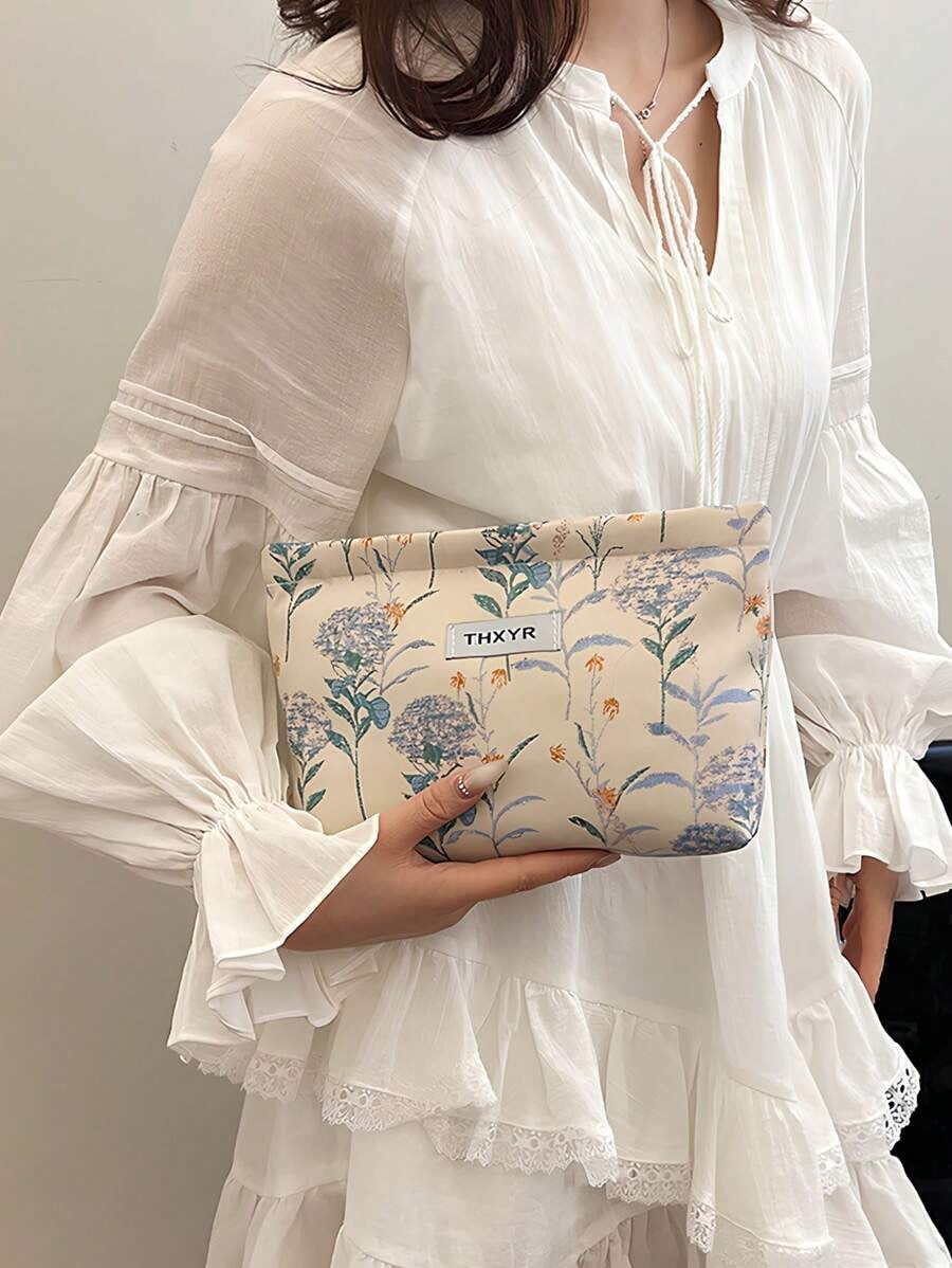SHEIN حقيبة مكياج زرقاء واسعة بطبعة زهور أنيقة