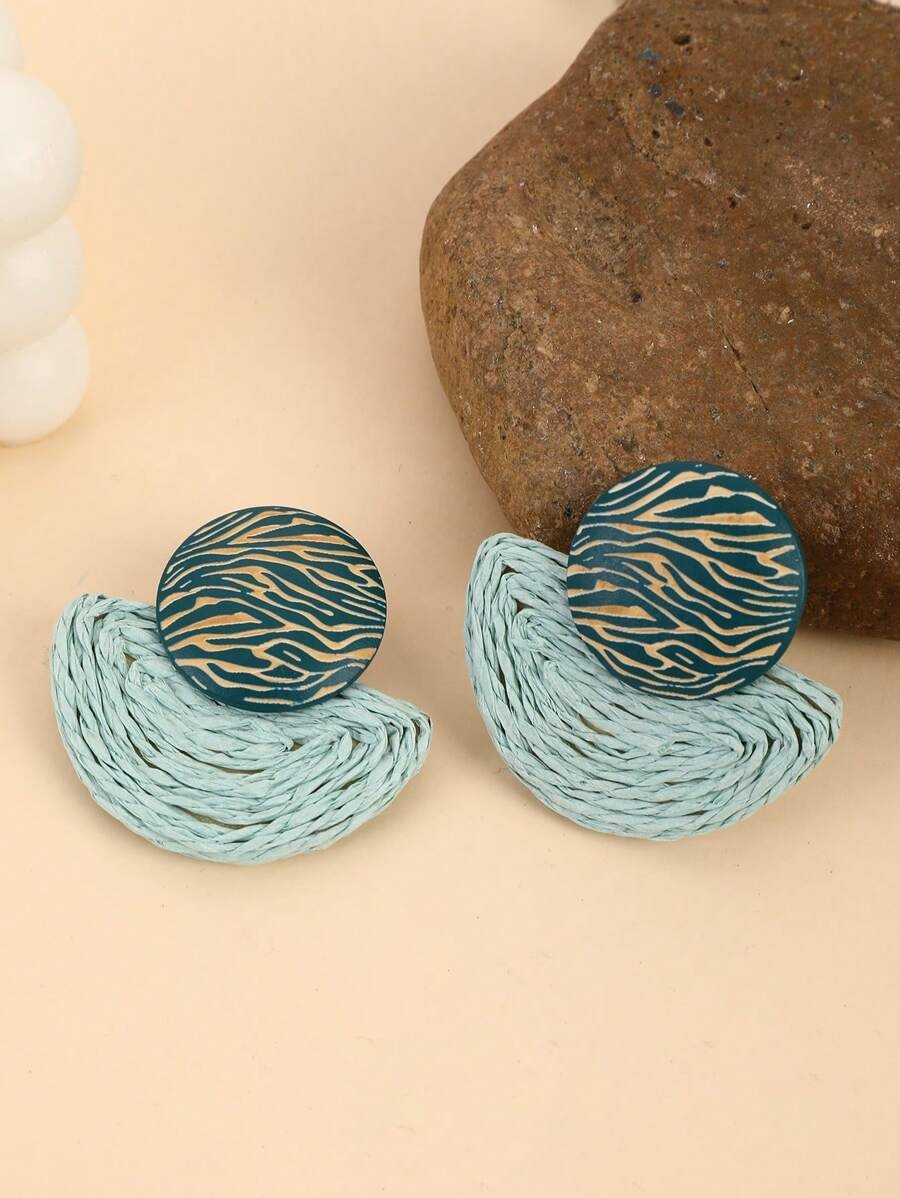 زوج أقراط وقلادة على شكل مروحة بتصميم خشبي بنسيج موجي