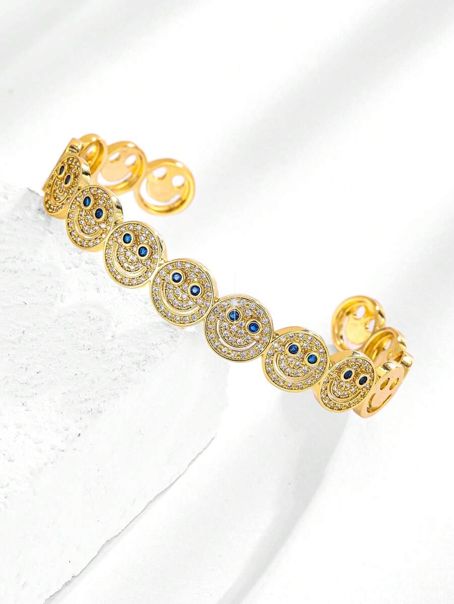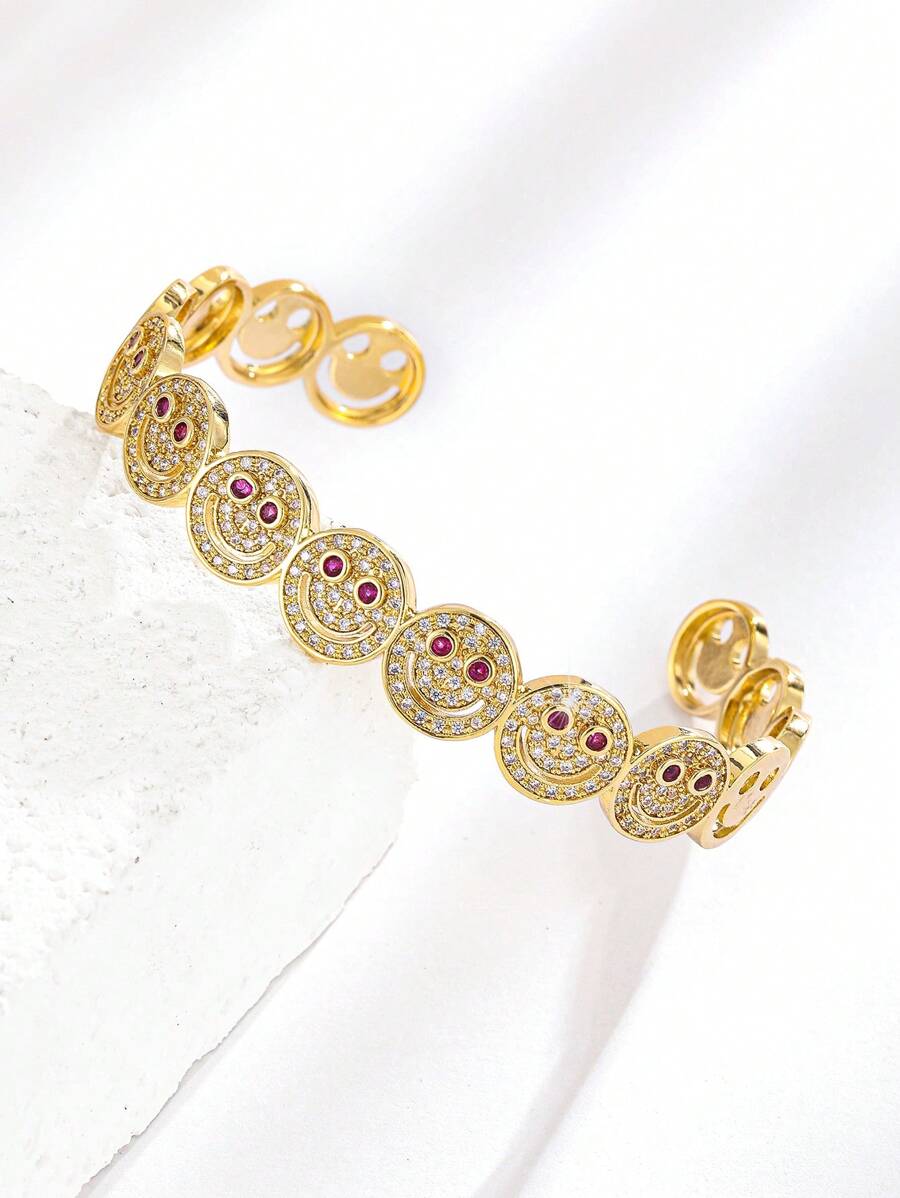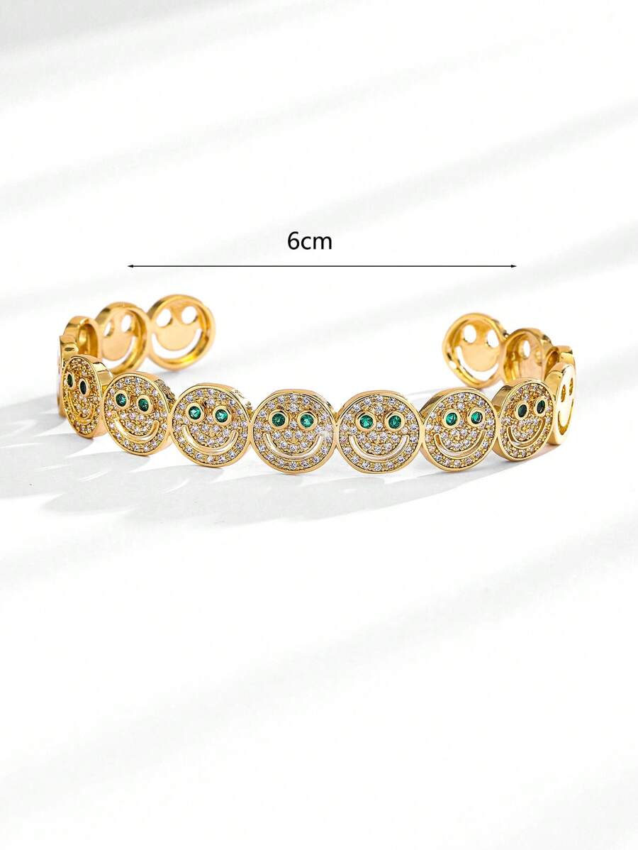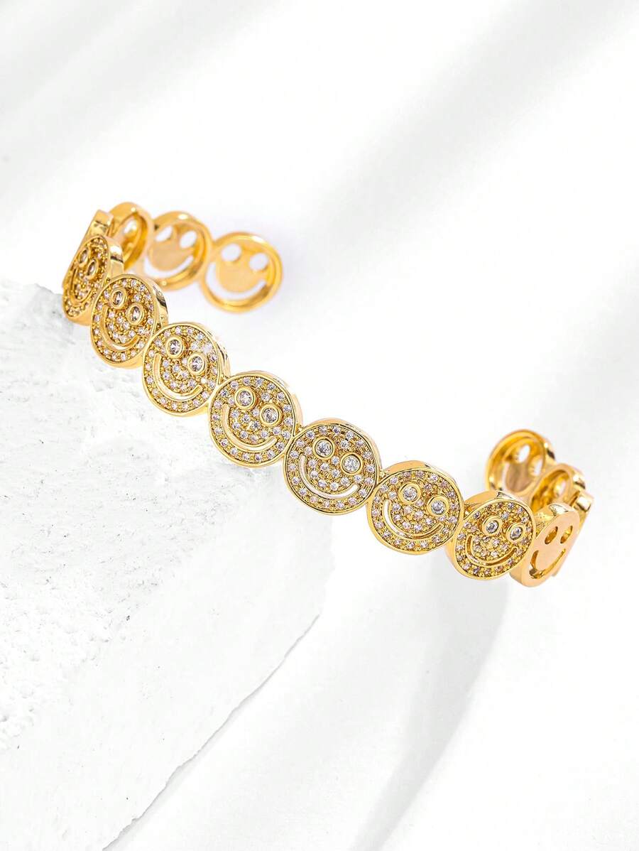قطعة أنيقة من الإكسسوارات النسائية بتصميم وجه مبتسم مرصع بأحجار الزركونيا المكعبة البراقة، مطلية بالنحاس باللون الذهبي. مثالية للإطلالات اليومية، الحفلات والتجمعات، تضيف لمسة مبهجة ومميزة لإطلالتك.