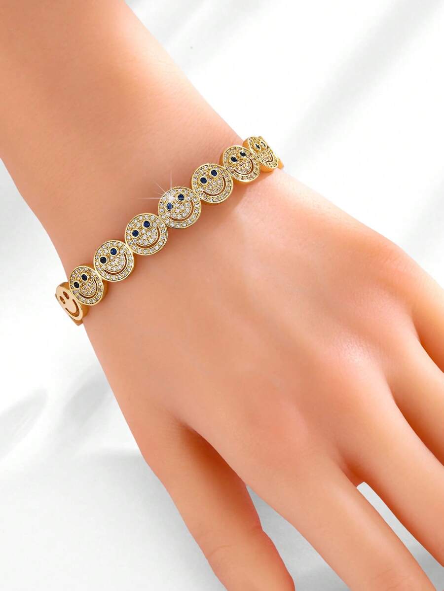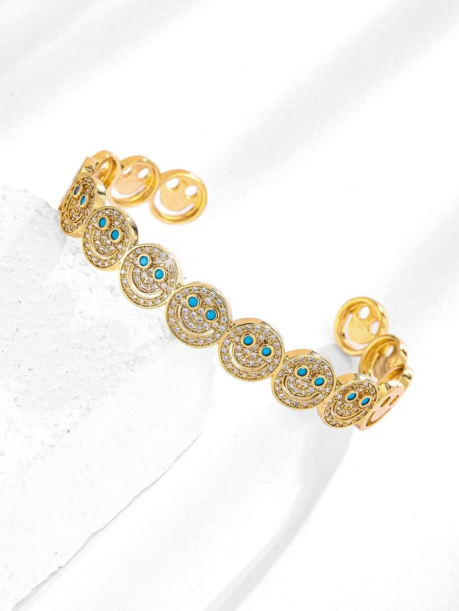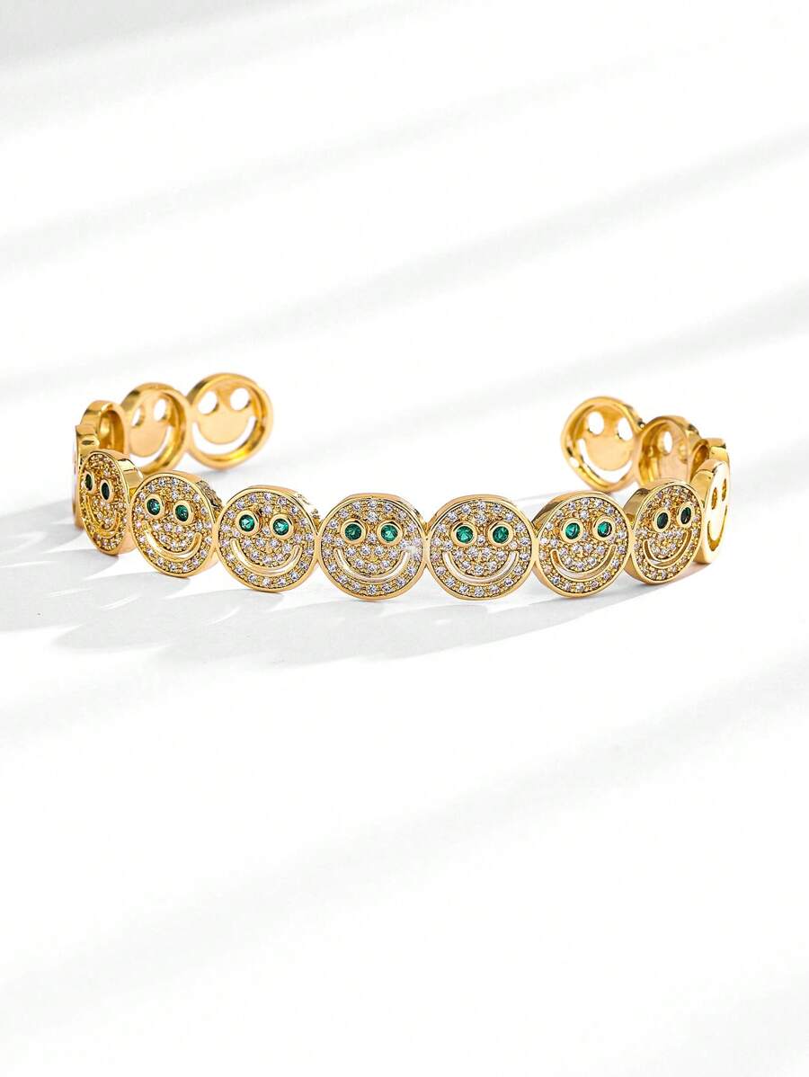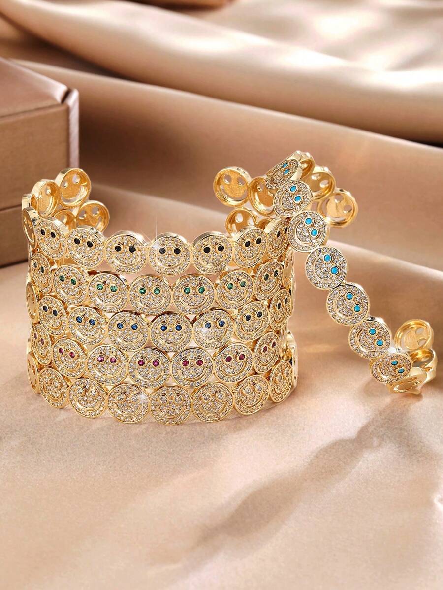 قطعة أنيقة من الإكسسوارات النسائية بتصميم وجه مبتسم مرصع بأحجار الزركونيا المكعبة البراقة، مطلية بالنحاس باللون الذهبي. مثالية للإطلالات اليومية، الحفلات والتجمعات، تضيف لمسة مبهجة ومميزة لإطلالتك.