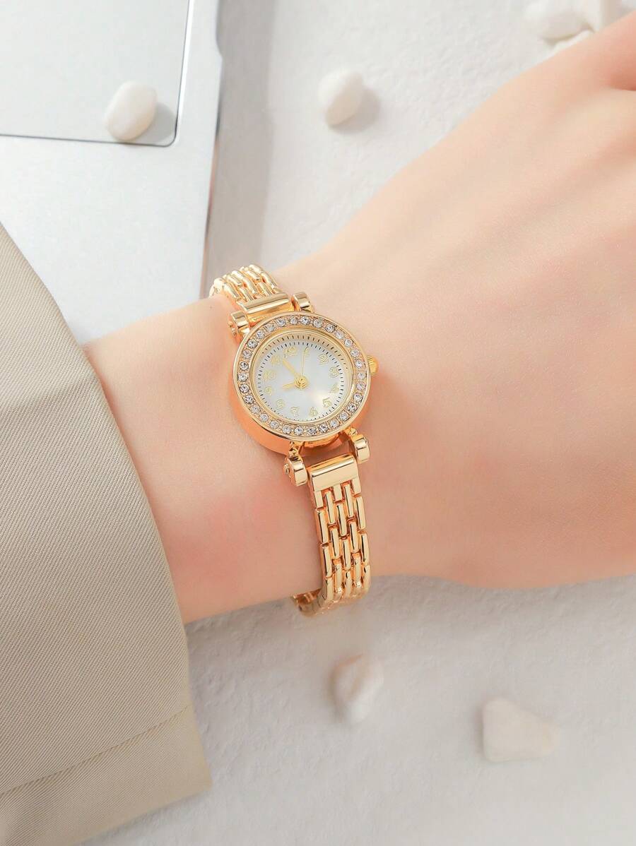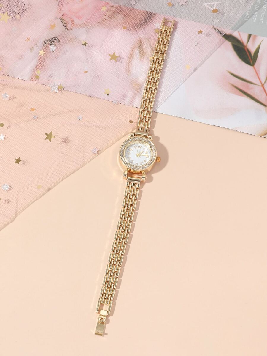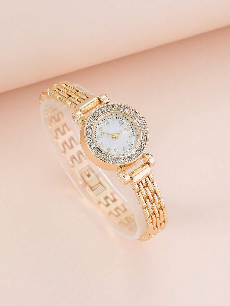 SHEIN ساعة كوارتز نسائية ذهبية مرصعة بالراين