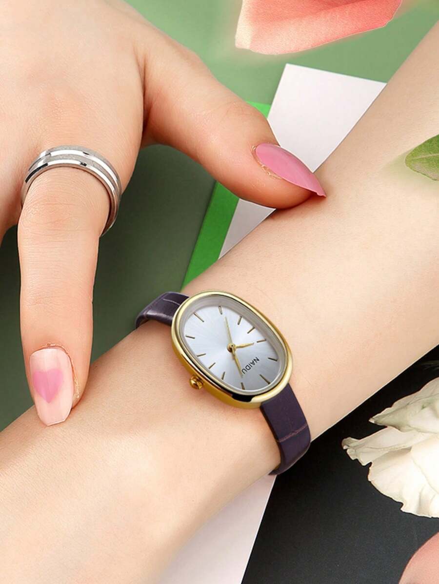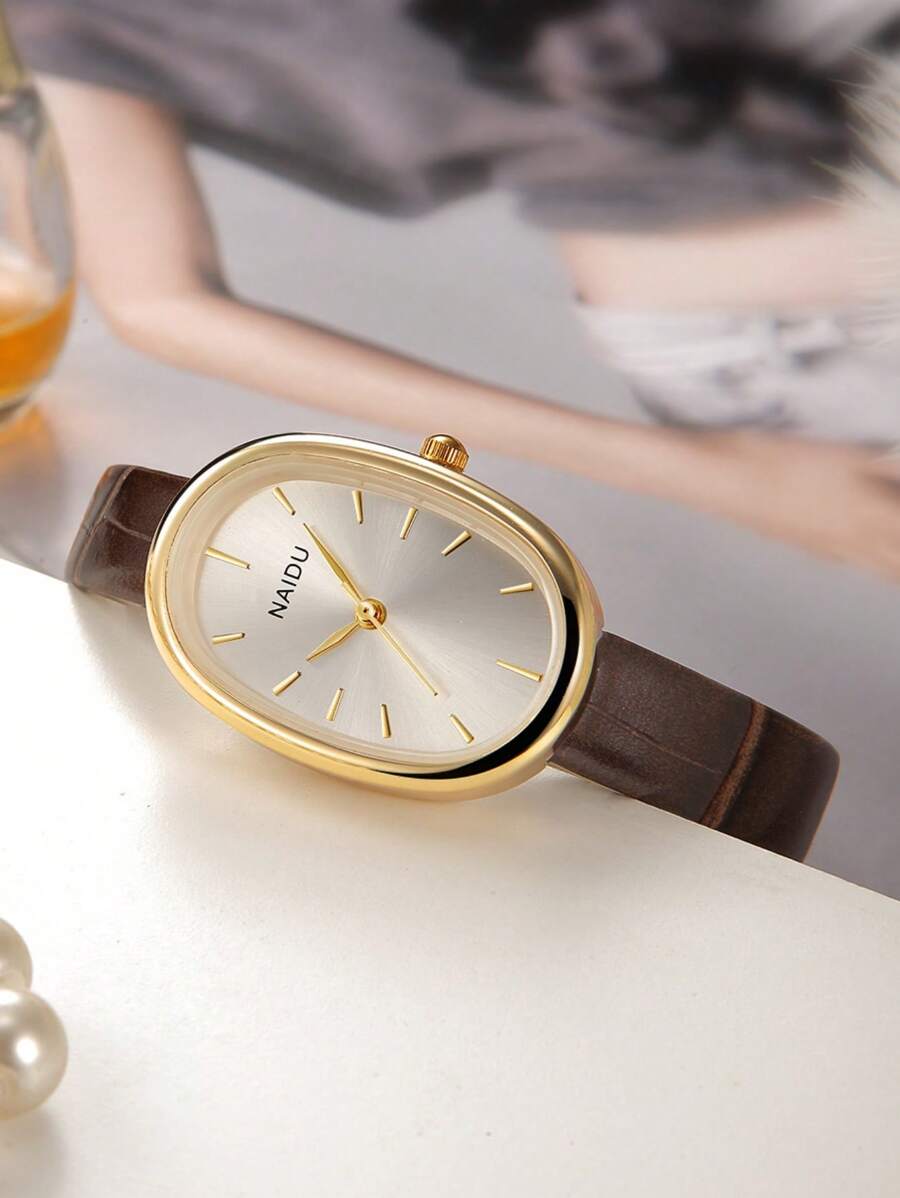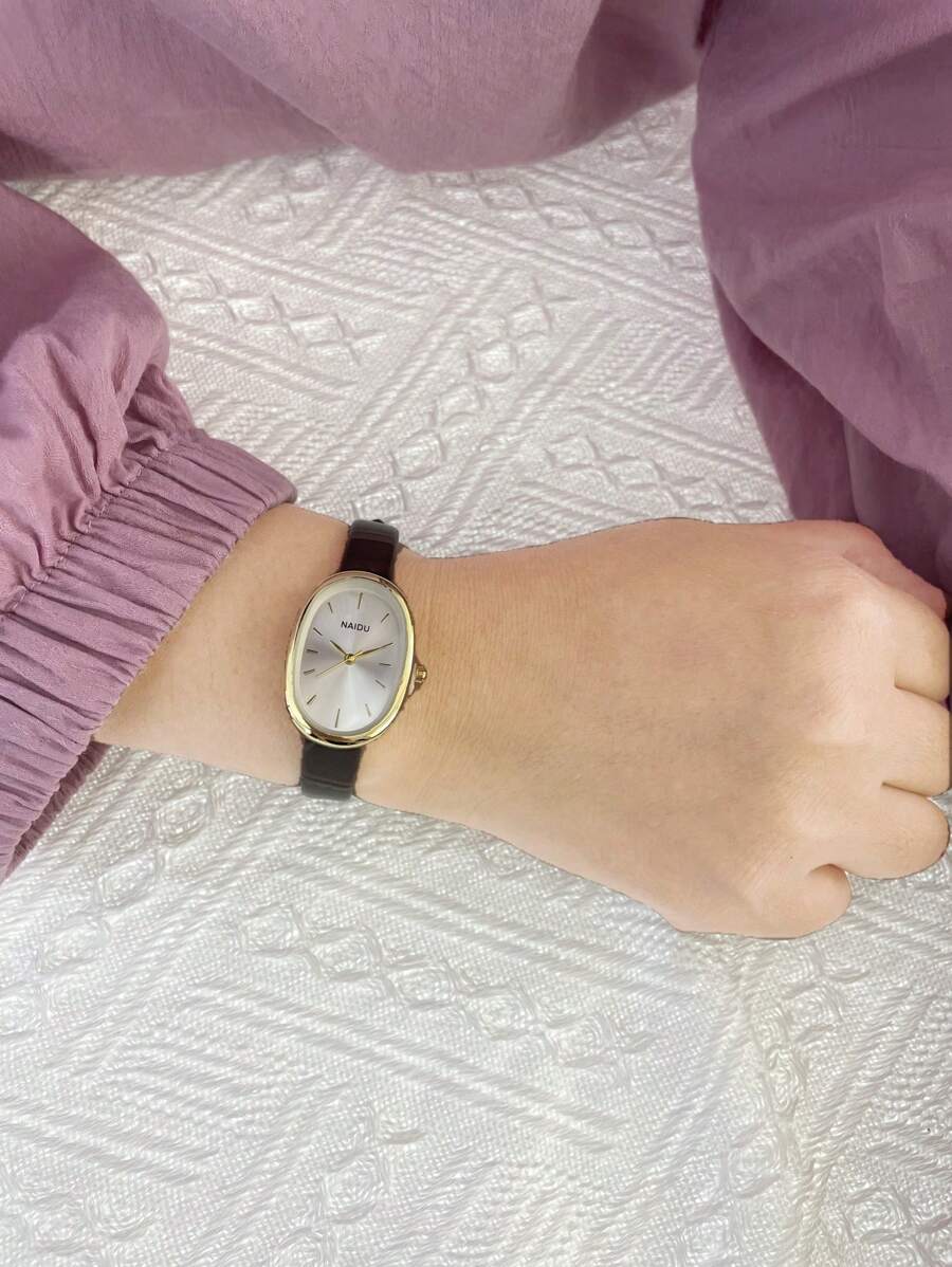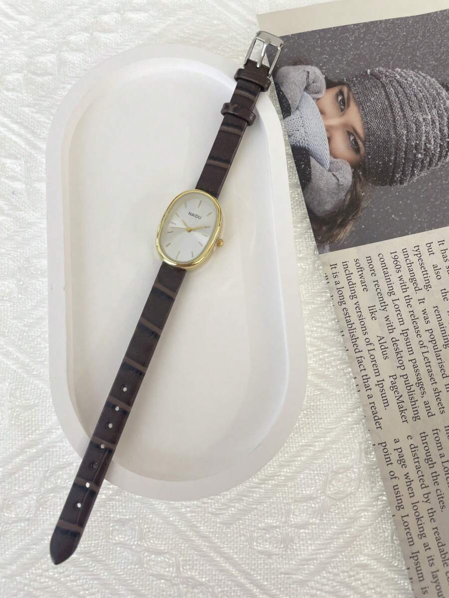 ساعة نسائية أنيقة وبسيطة بقرص بيضاوي وميكانيكية كوارتز، تصميم كلاسيكي مع حزام جلدي، مناسبة للارتداء اليومي.