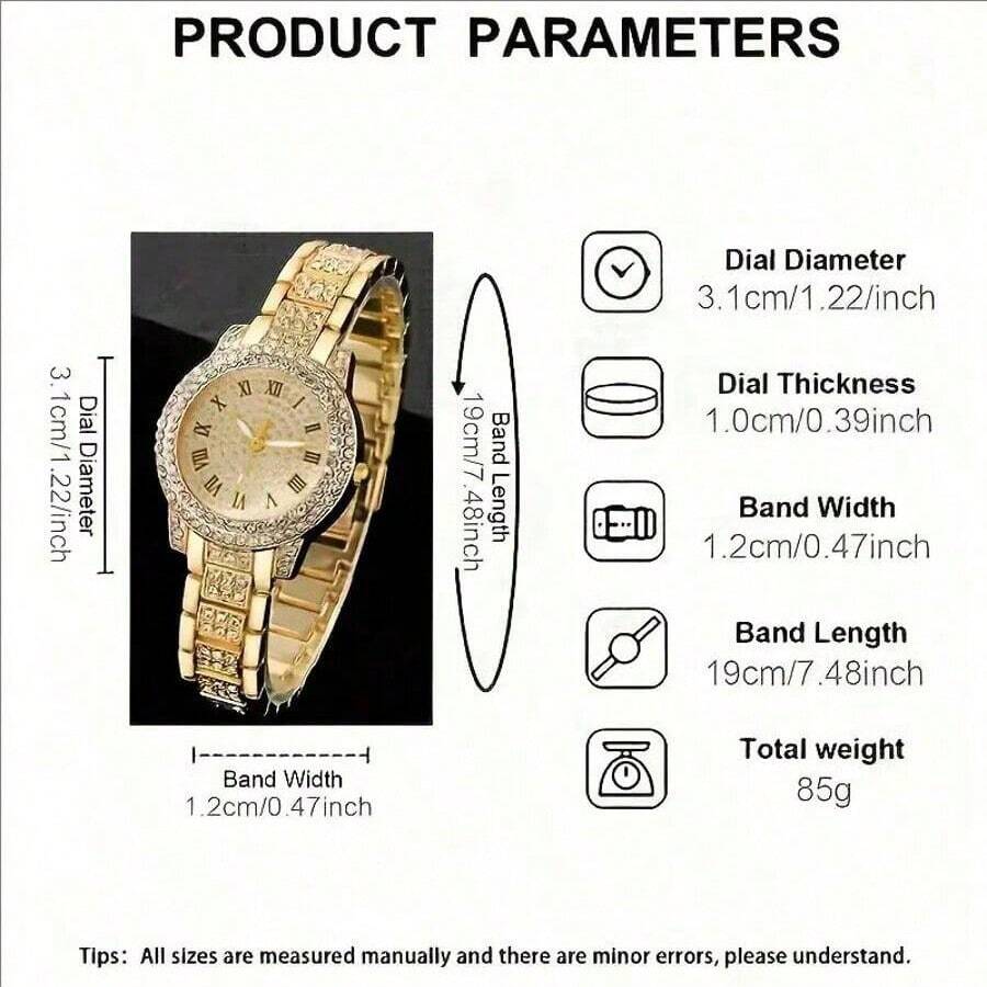 ساعة أنيقة مرصعة بحجر الراين مع عقارب رومانية فاخرة، تعمل بآلية كوارتز دقيقة. تصميم عصري يلائم الإطلالات اليومية والمناسبات الخاصة مثل الأعراس أو عطلة الشاطئ أو عيد الحب.