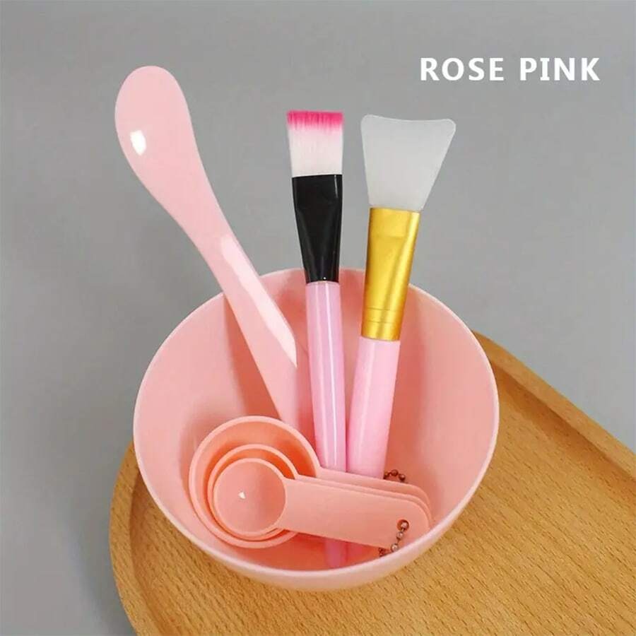 طقم عملي فيه كل اللي تحتاجيه لتحضير وتطبيق الماسكات: فرشاة، وعاء، ملعقة، مجرفة، وملاعق قياس. الخامة قوية وسهلة التنظيف، واللون الوردي المغبر يعطي لمسة ناعمة ومنظمة لروتين العناية بالبشرة.