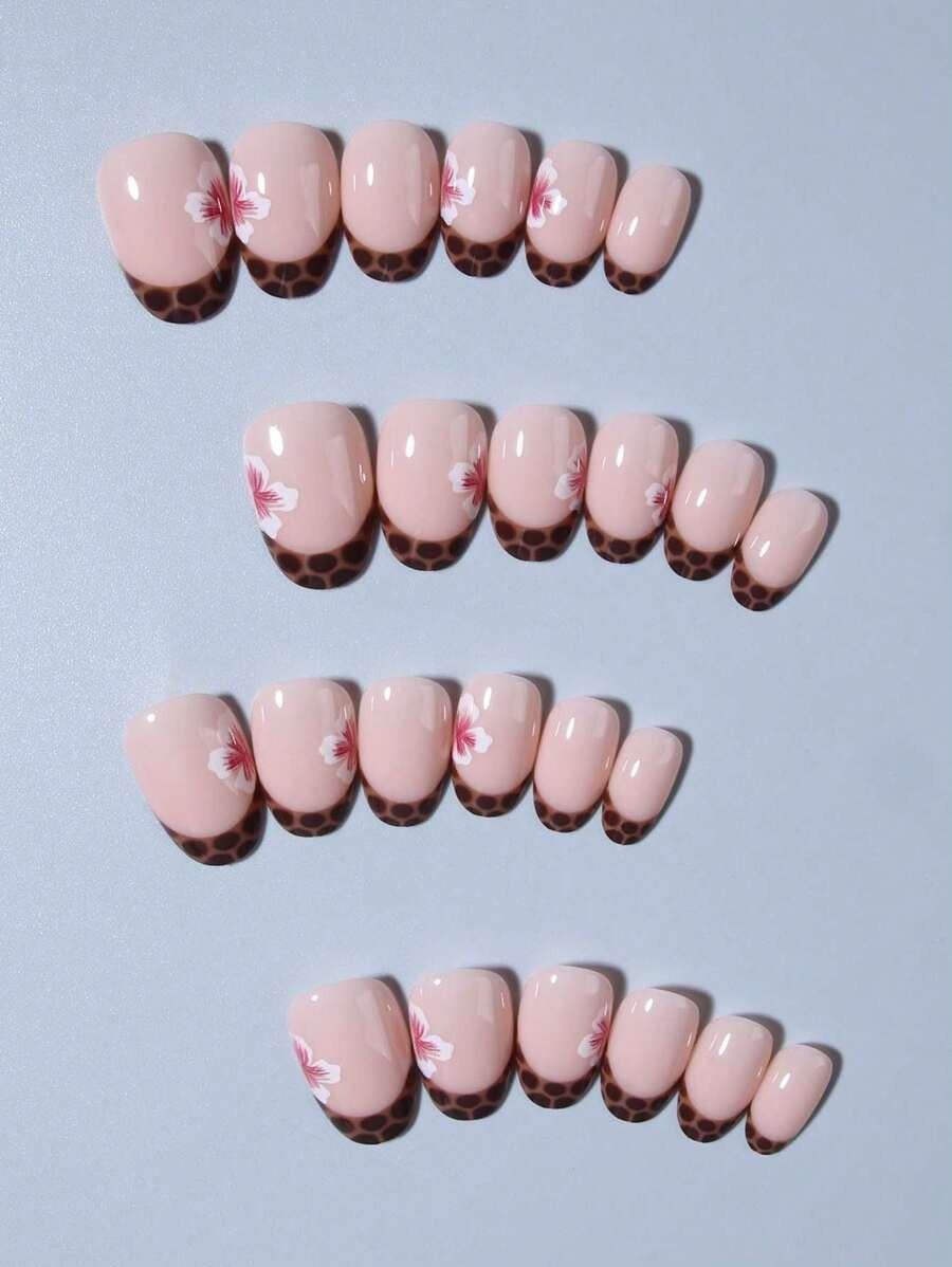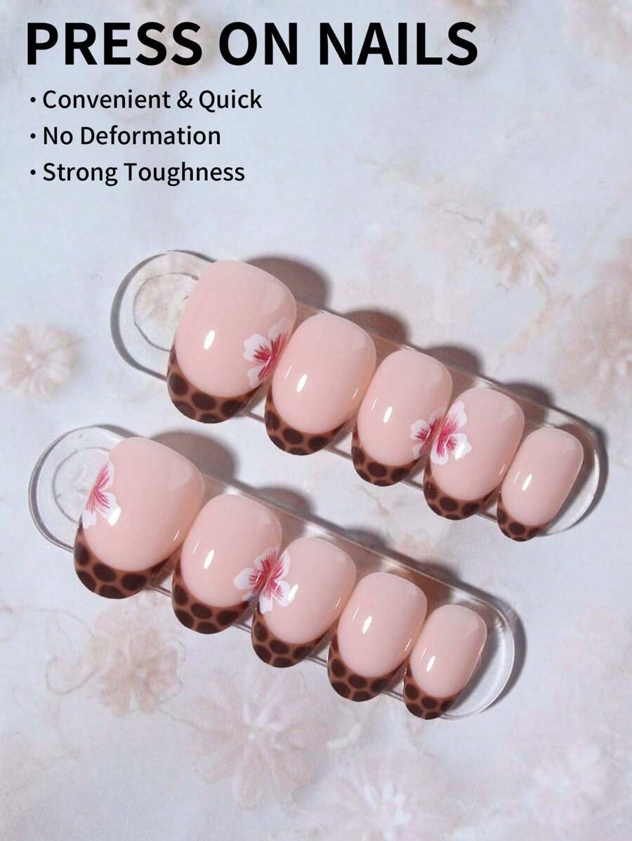 أظافر اصطناعية قصيرة على شكل لوز، مزينة بتصميم الأزهار والنمر الفرنسي، تشمل 1 غراء جيلي و1 مبرد أظافر، مناسبة للاستخدام اليومي، الحفلات، وارتداء الصيف.