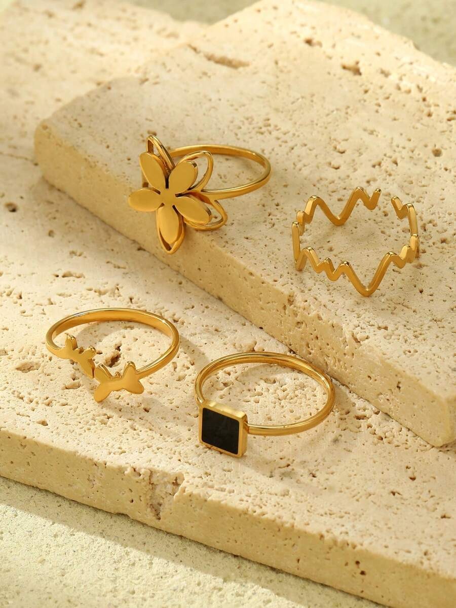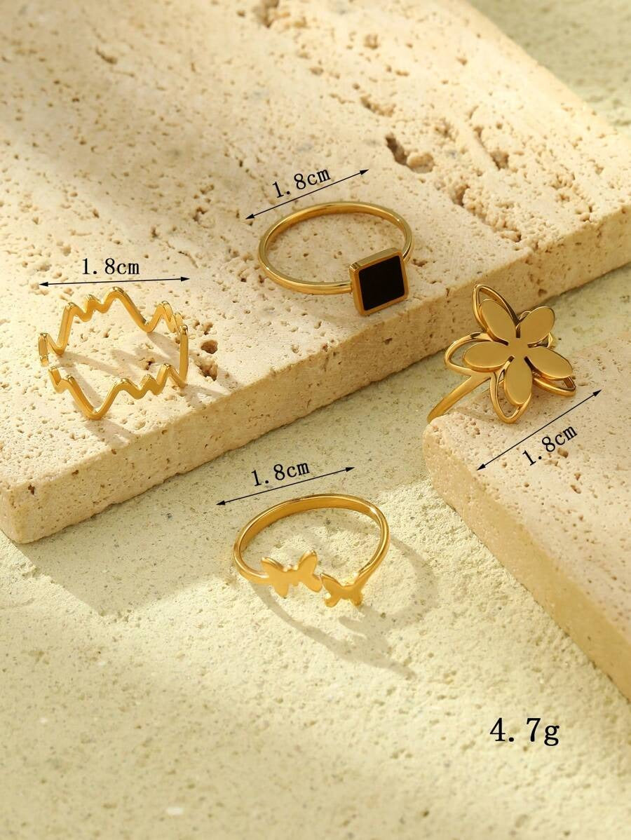 طقم أنيق من 4 خواتم مربعة مصنوعة من الفولاذ المقاوم للصدأ، بقاعدة سوداء ولمسات ذهبية برسومات فراشات، ورد وأشكال طبية ناعمة. يعطي طلة ستايلش ومميزة، مناسب للهدية أو الاستخدام اليومي.
