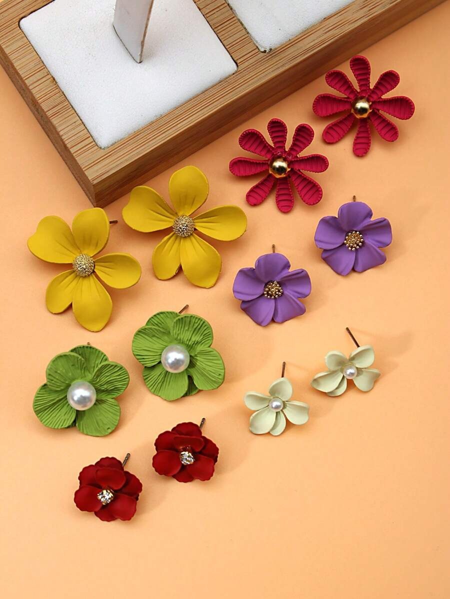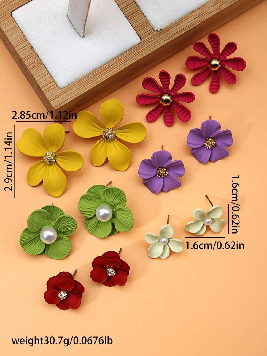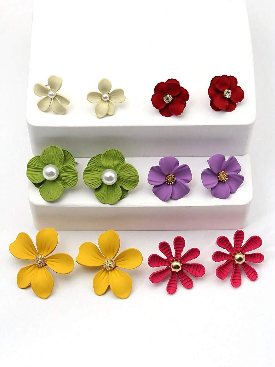 طقم أنيق 6 أزواج أقراط على شكل زهرة، تصميم لطيف وملون، مزين بحبات لؤلؤ تضيف لمسة راقية. خفيفة وعملية، وتكمّل أي طلة بنعومة وأنوثة.
