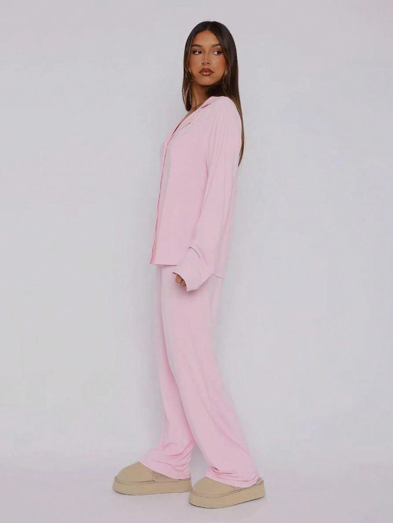 طقم ناعم وفضفاض مكوّن من بلوزة طويلة الأكمام بياقة كلاسيكية وزرار قدام، مع بنطلون مستقيم وواسع. قماش مريح ومرن شوية، يعطي إحساس دافي من غير ما يكون مبطن، مثالي للجو البارد.