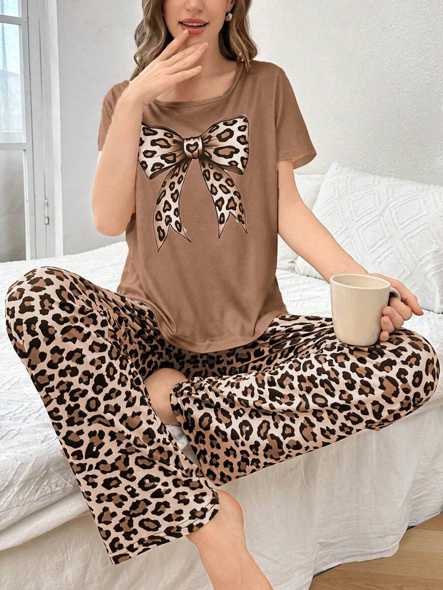 طقم بيجامة نسائي أنيق ومريح، يتكون من ملابس علوية قصيرة الأكمام وبنطلون طويل مزين بطبعة فهد جذابة وربطة عنق. تصميم عملي وجميل مع عقدة فراشة ورباط أمامي وخلفي