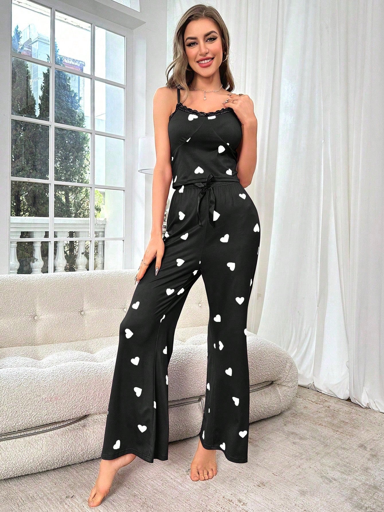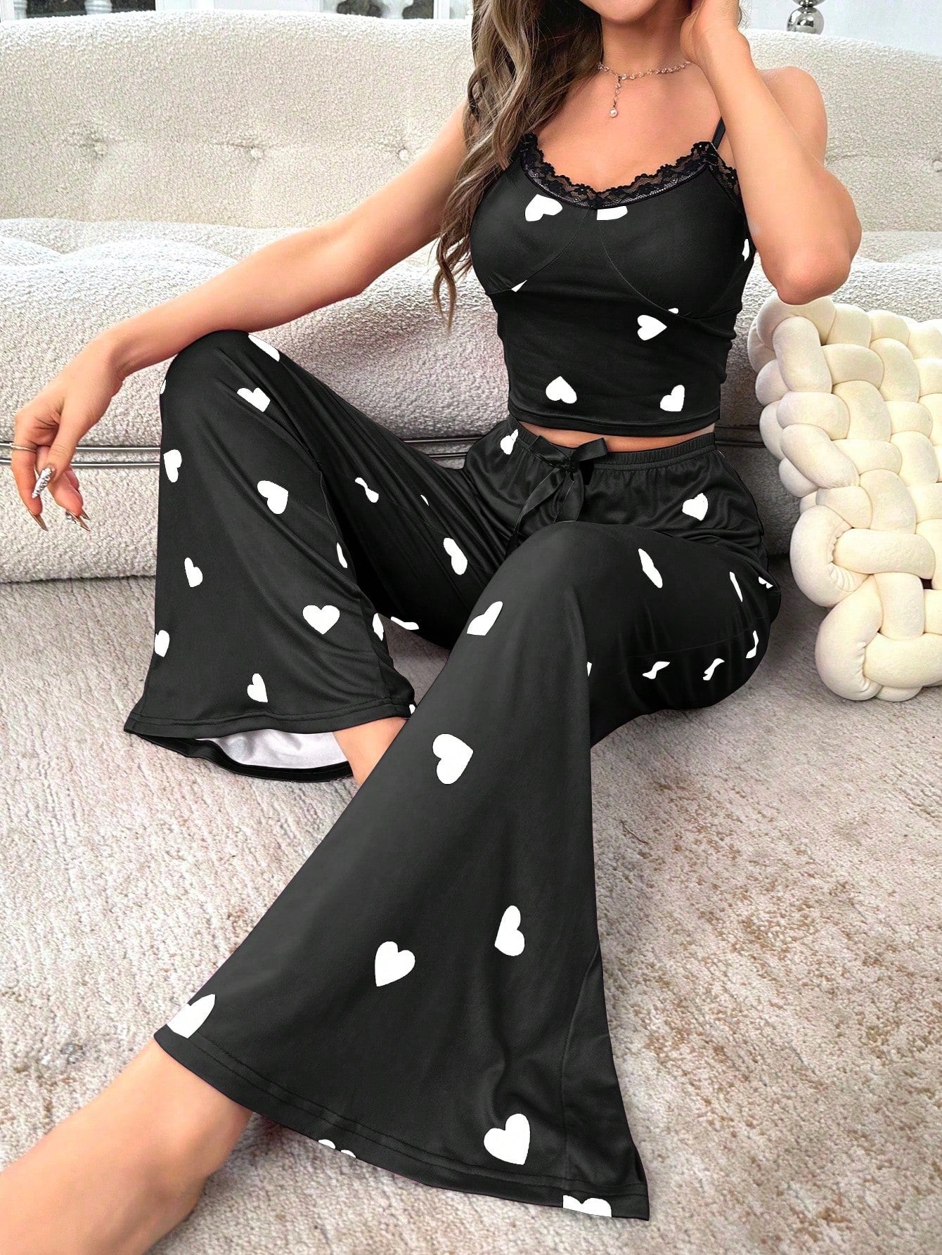 طقم بيجامة أنيق مكون من قطعتين: فوطة بخطوط قلب وبلوزة قصيرة بدون أكمام، وبنطلون طويل مع تشطيب دانتيل جميل.
