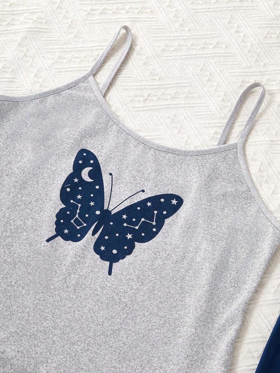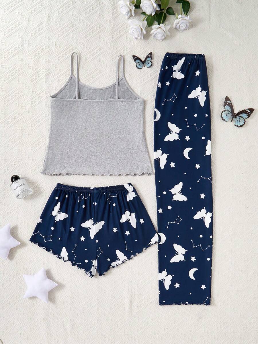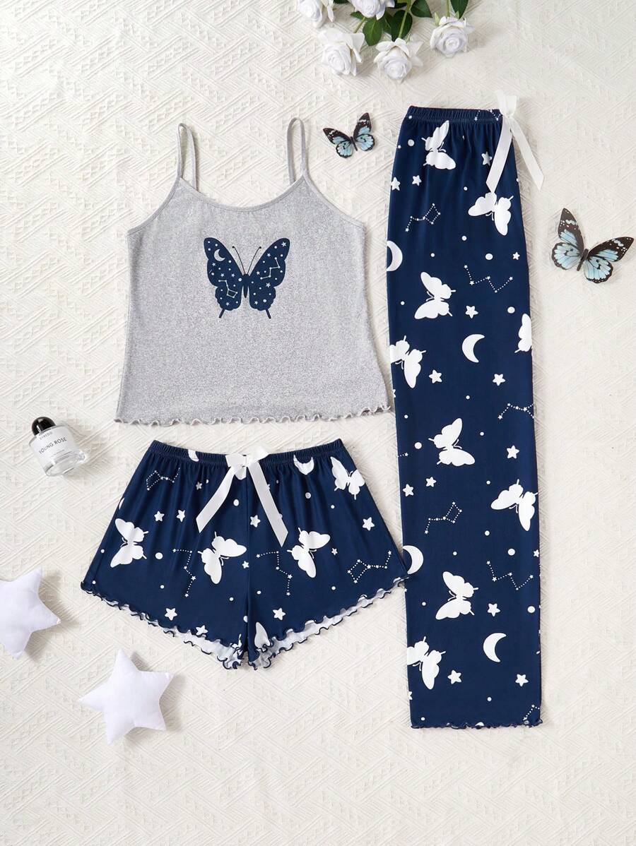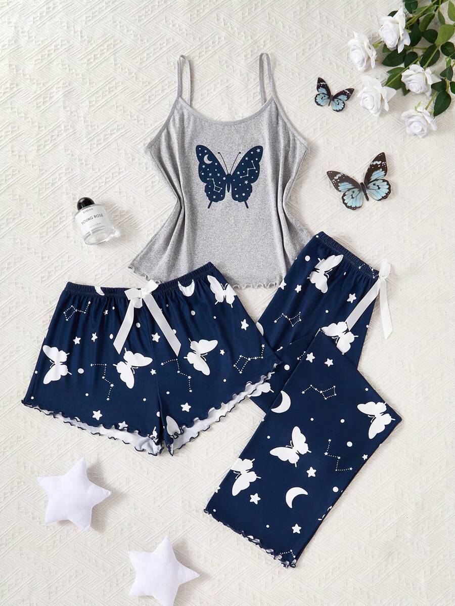 SHEIN طقم بيجامة نسائي 3 قطع مطبوع بالفراشات والفضاء
