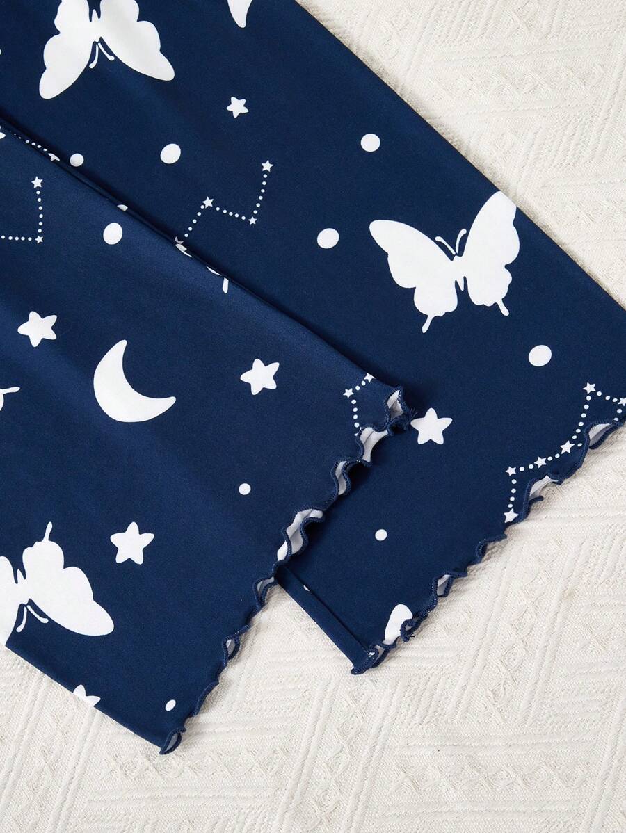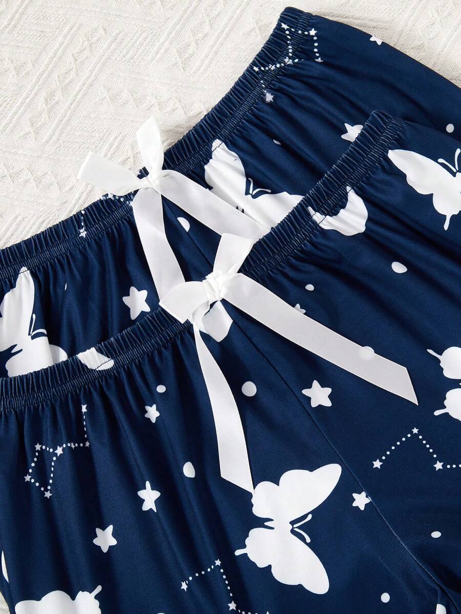 طقم بيجامة نسائي جذاب يتكون من 3 قطع، مزين بعقدة الفراشة وزينة على شكل نبات، مع طبعات فراشات ومجرة ساحرة