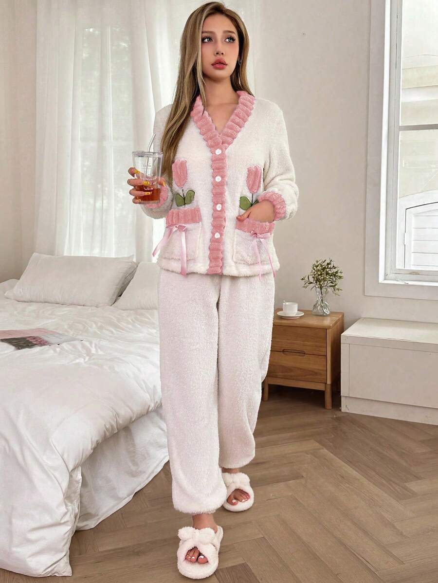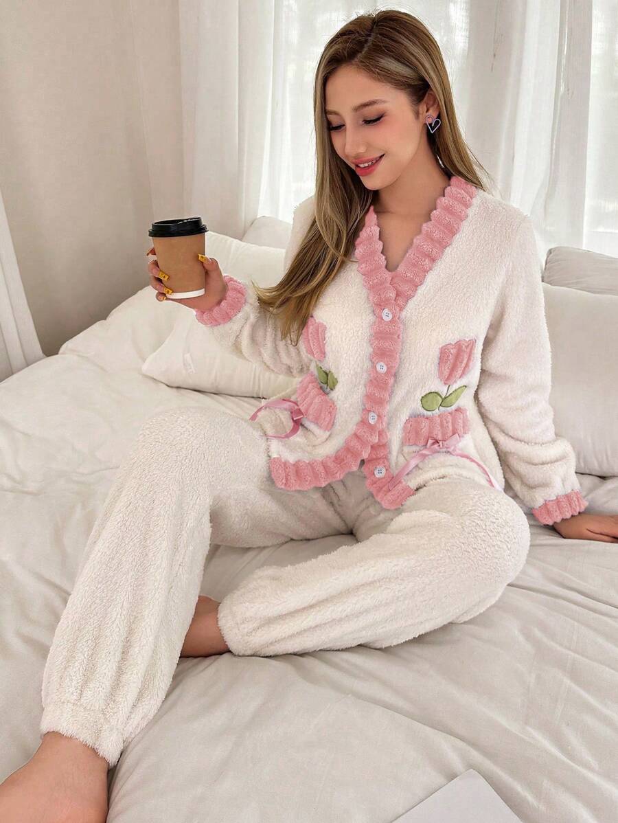 SHEIN طقم بيجامة وردي مطرز زهور وفيونكة بأكمام طويلة