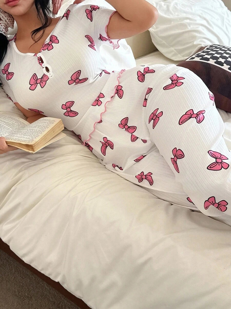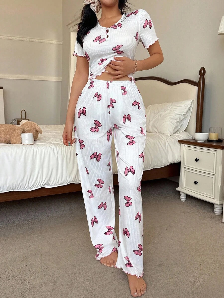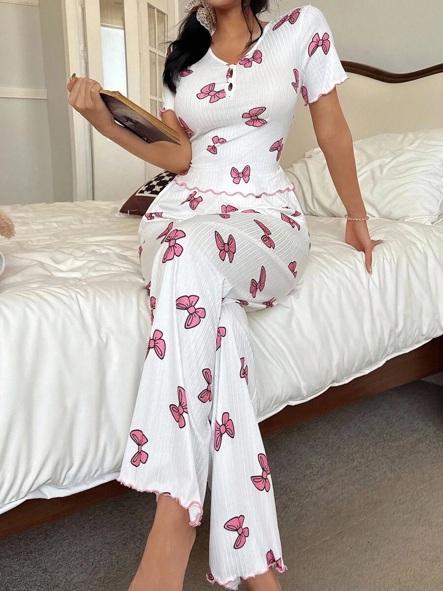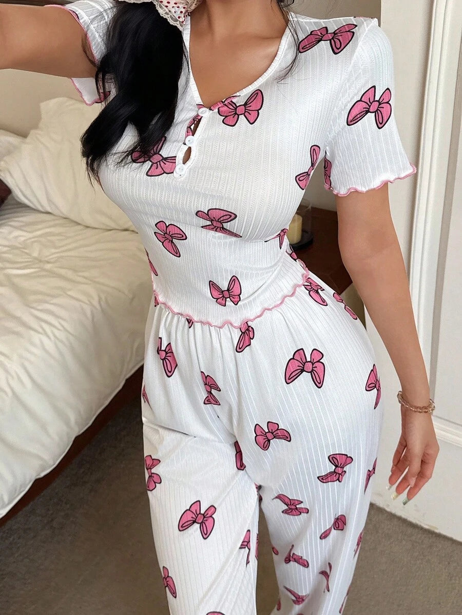 مجموعة بيجامات نسائية قصيرة الأكمام بياقة على شكل حرف V وسحاب نصفي مطبوع بشريط وردي