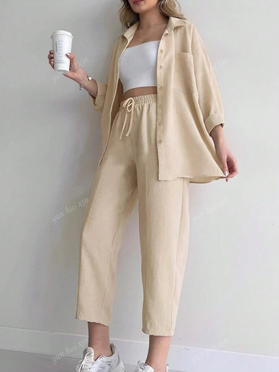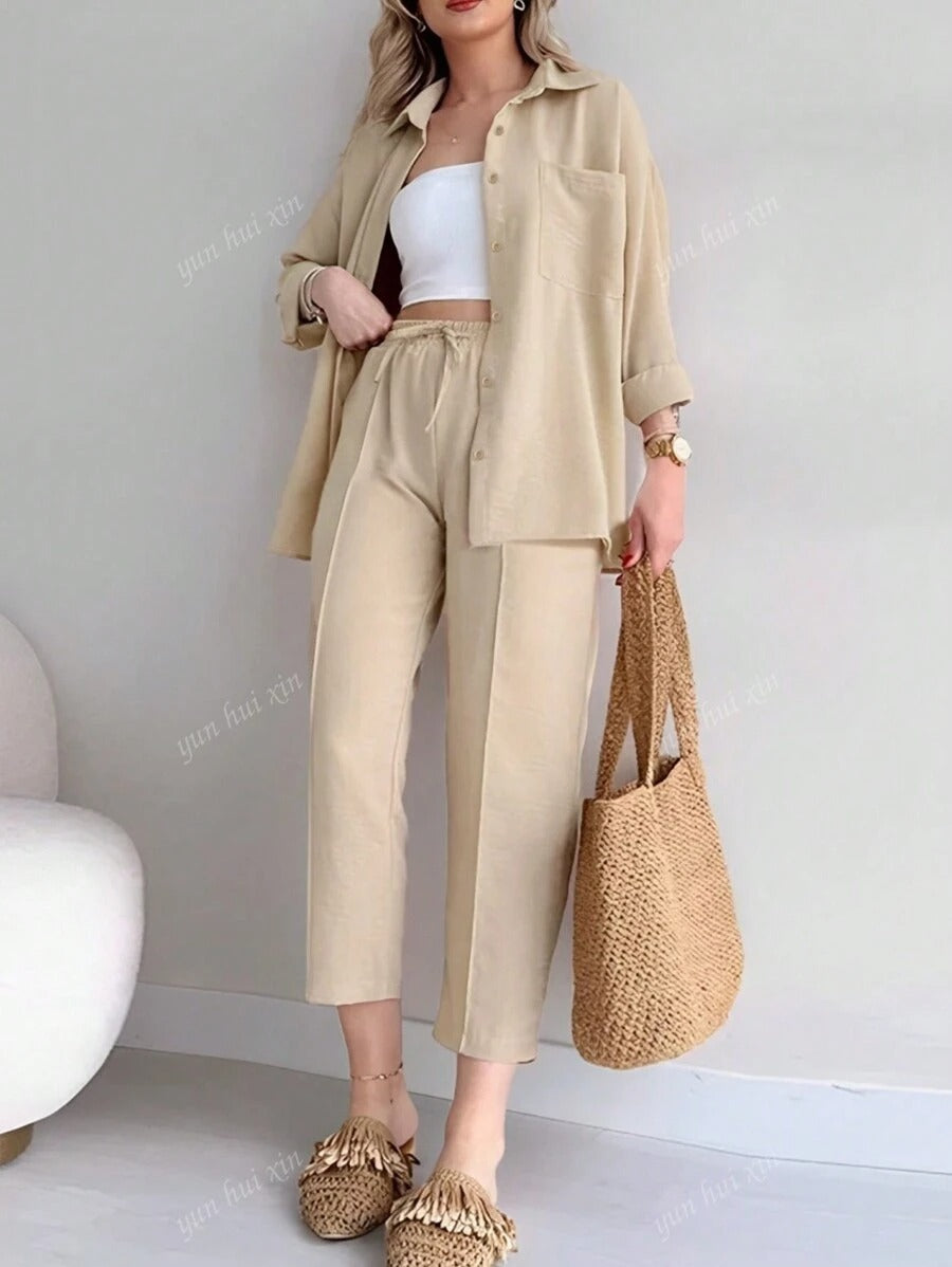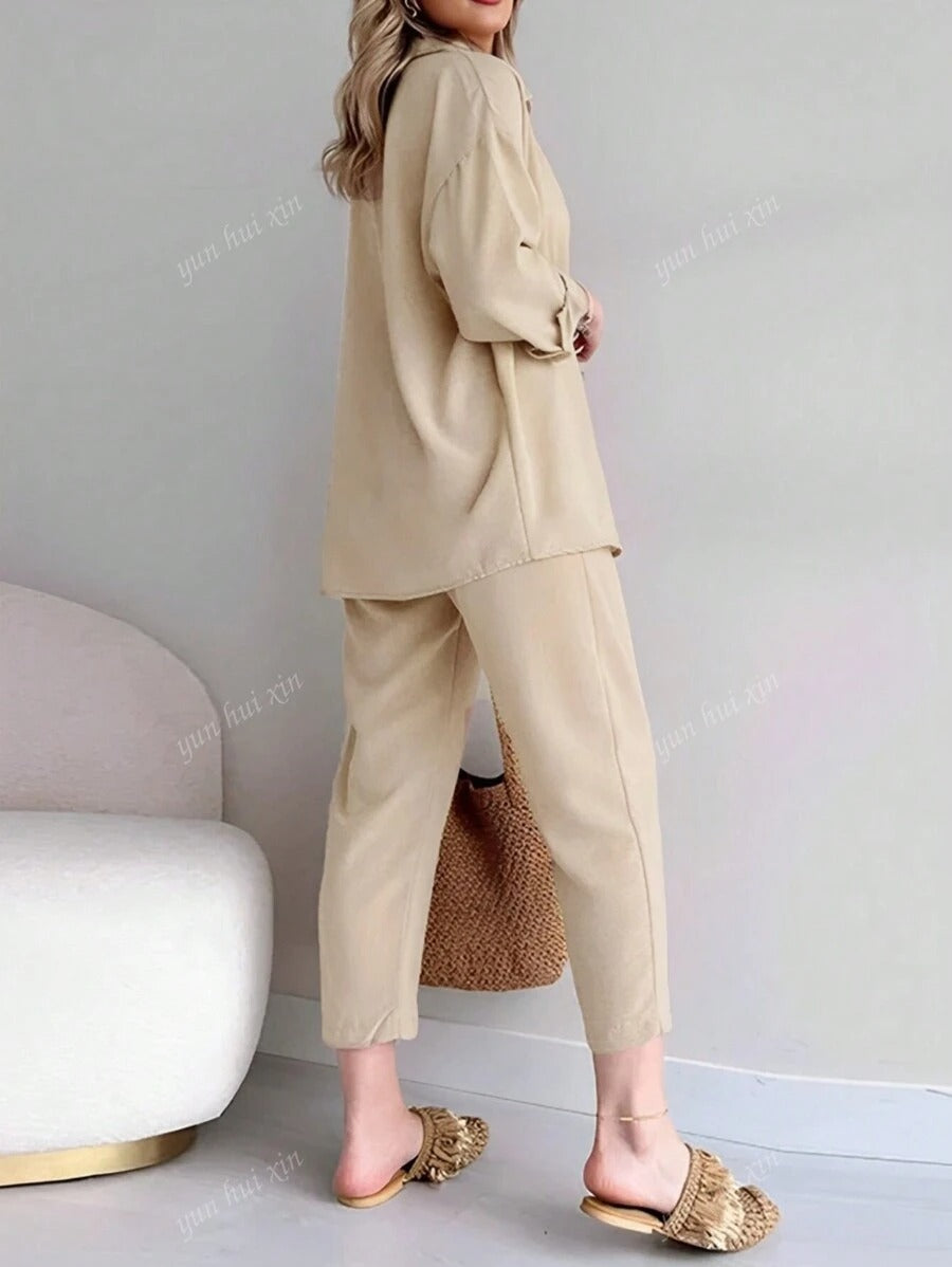 طقم كاجوال ناعم مكون من بلوزة طويلة الأكمام بأزرار وياقة كلاسيك، مع بنطلون واسع برباط خصر. قماش خفيف ومريح