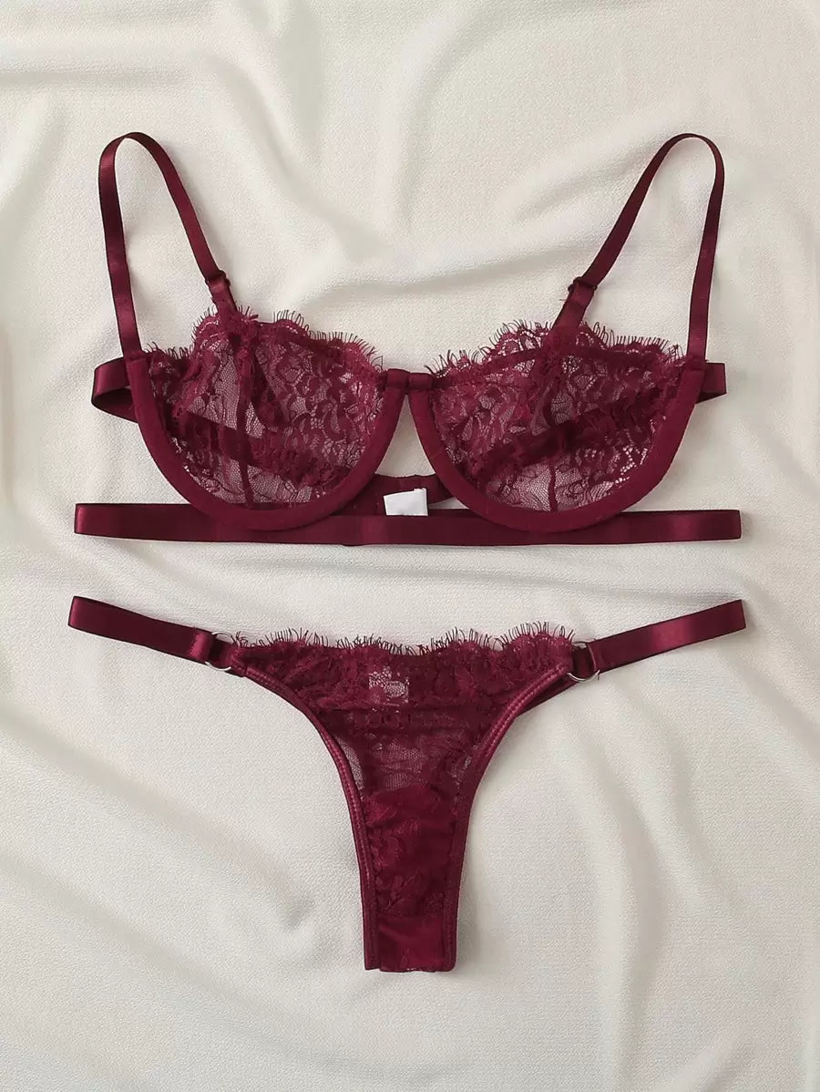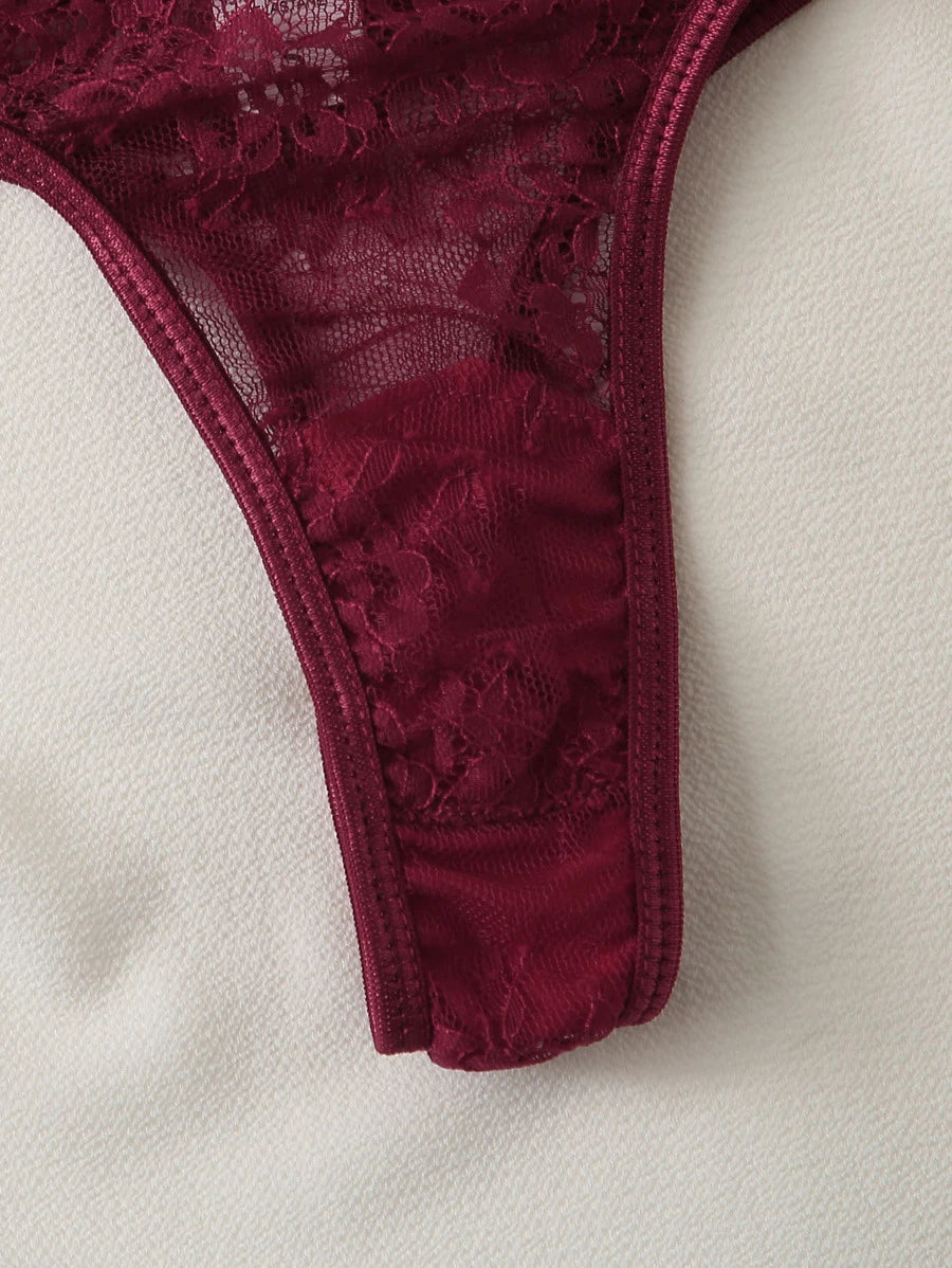 🍷 مجموعة لانجري رومانسية دانتيل باللون العنابي – ثونغ + صدرية سلكية