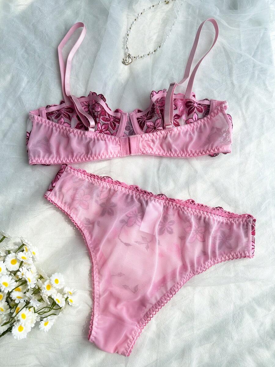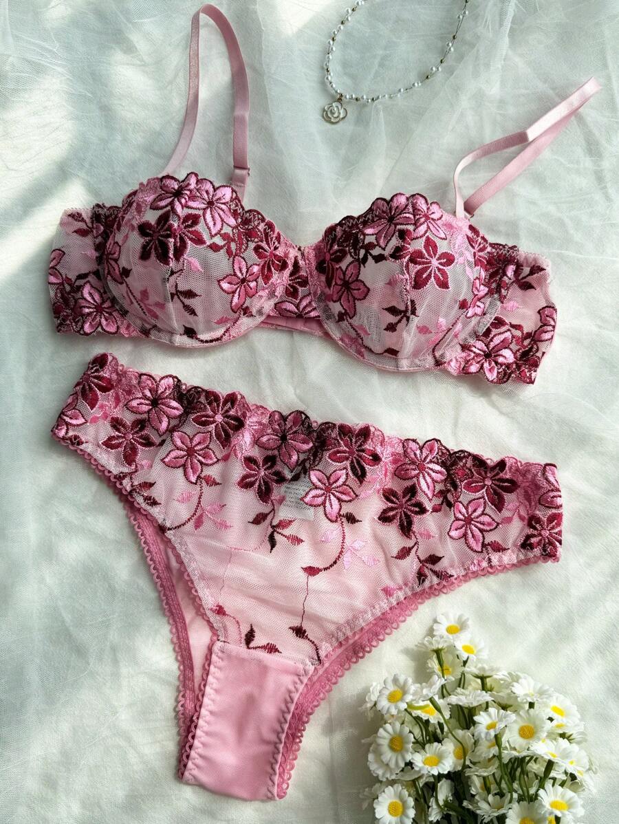مجموعة داخلية أنثوية راقية مكونة من حمالة صدر مطرزة وسروال داخلي وردي بتصميم رومانسي مزين بالزهور. خامة ناعمة وشفافة مع أشرطة قابلة للتعديل تمنحك مظهرًا أنيقًا وجذابًا مثاليًا للعروس أو الليالي الخاصة.