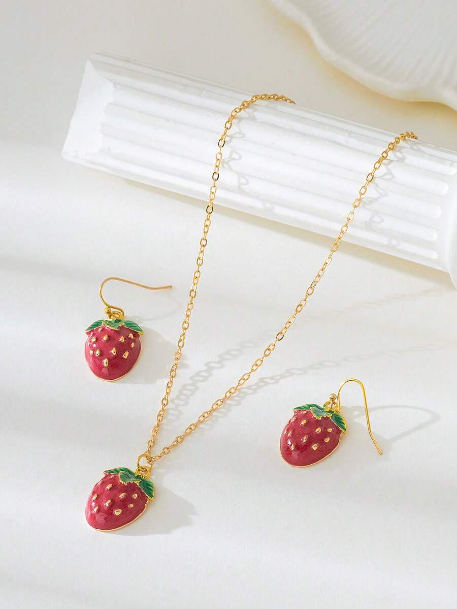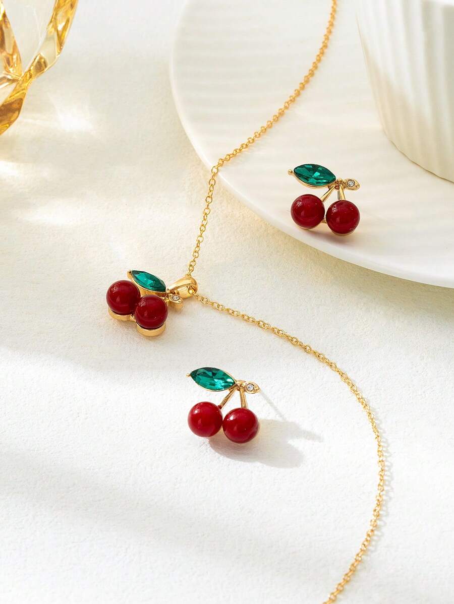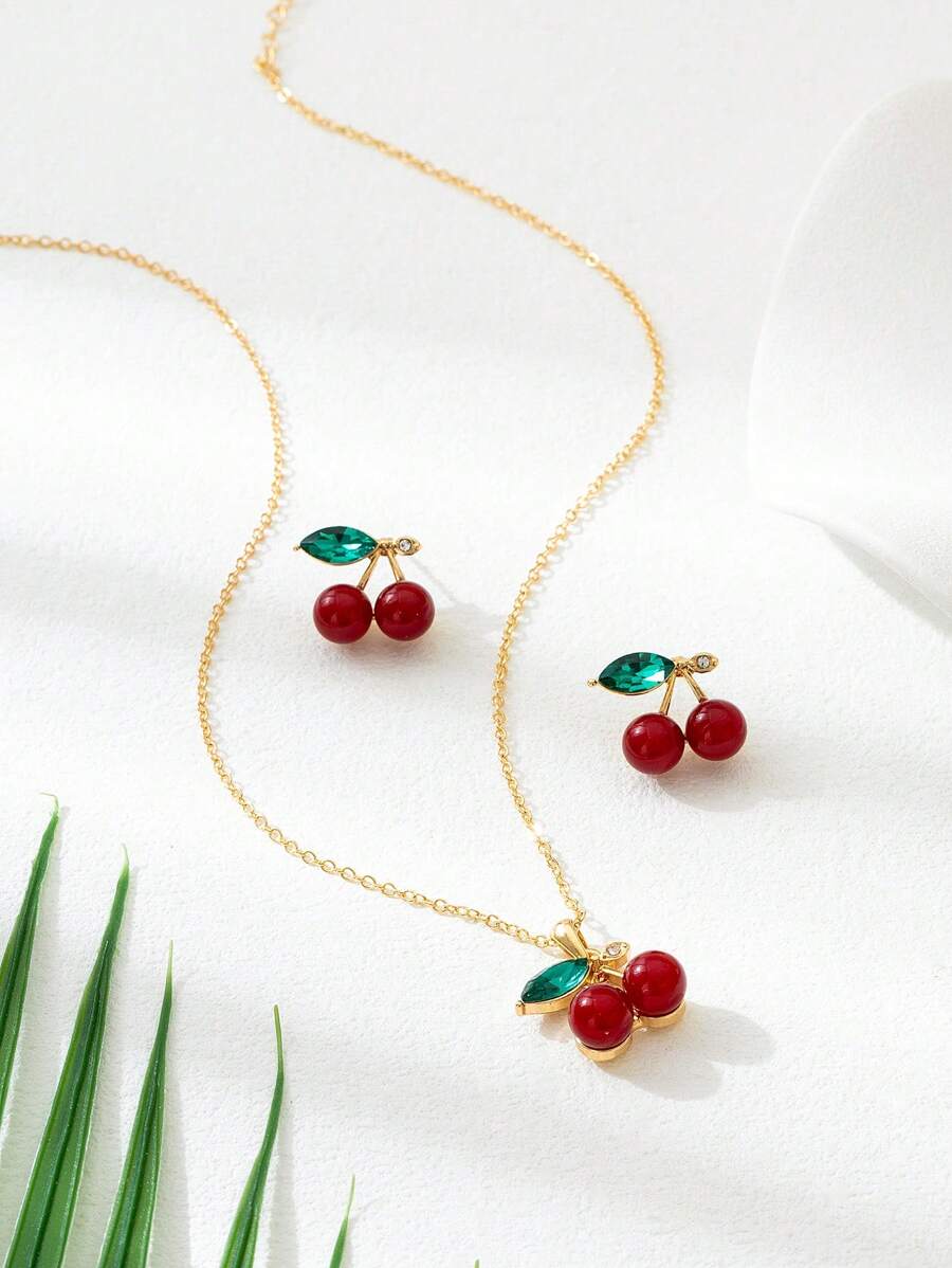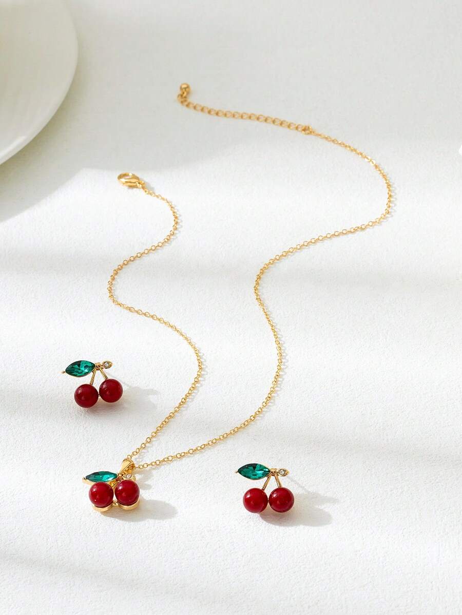 SHEIN طقم مجوهرات قرطان وقلادة بتصميم الكرز والفراولة