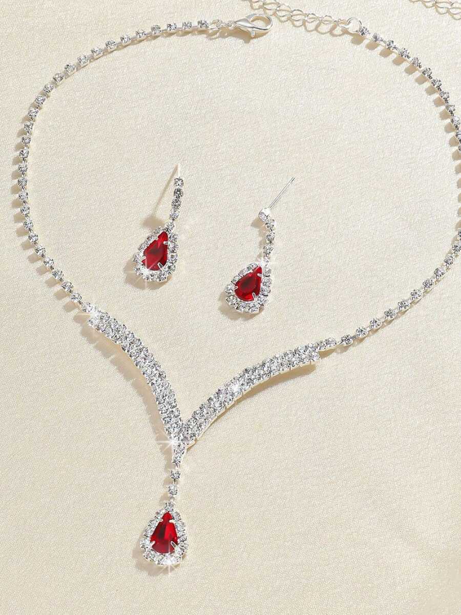 💃 طقم مجوهرات أحمر من قلادة وأقراط بزركونيا مكعبة
