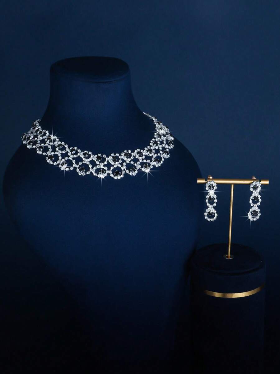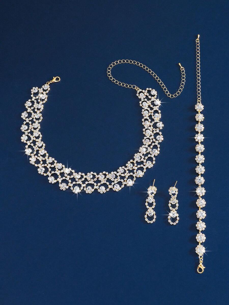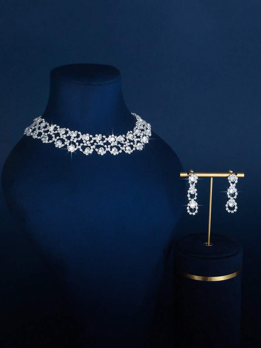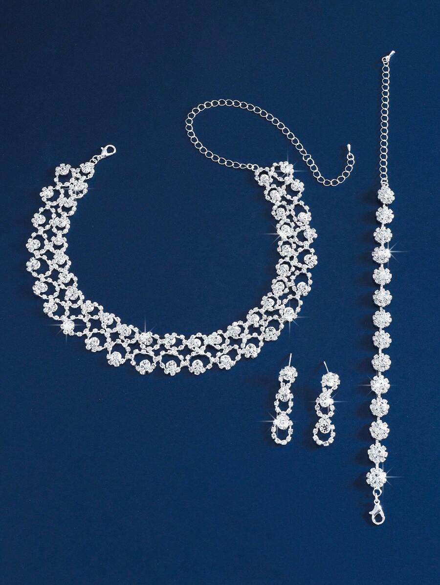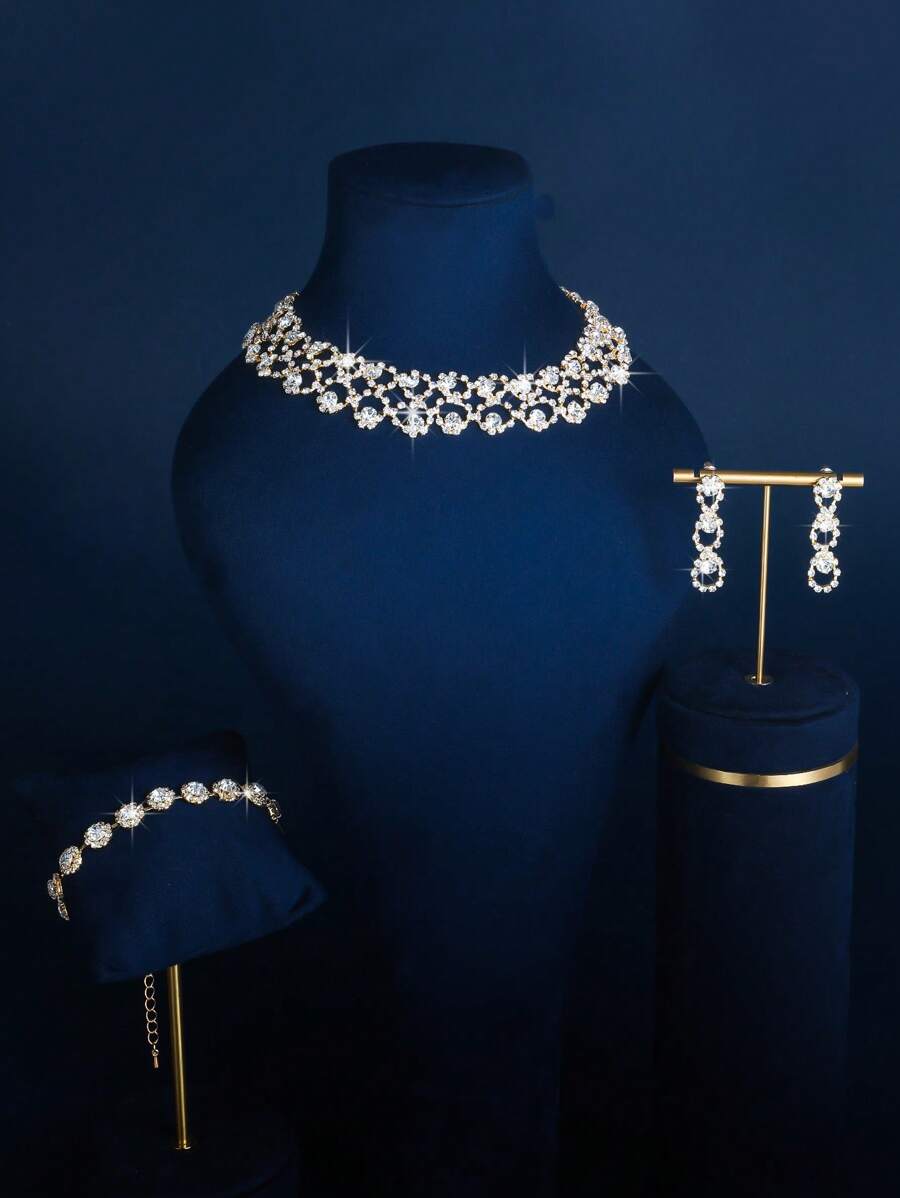 مجموعة أنيقة مكونة من عقد مرصع بالراين، قلادة وأساور، مثالية لإطلالات الزفاف والحفلات والاستقبال، ويمكن ارتداؤها أيضًا يوميًا لمزيد من الأناقة.المواصفات: