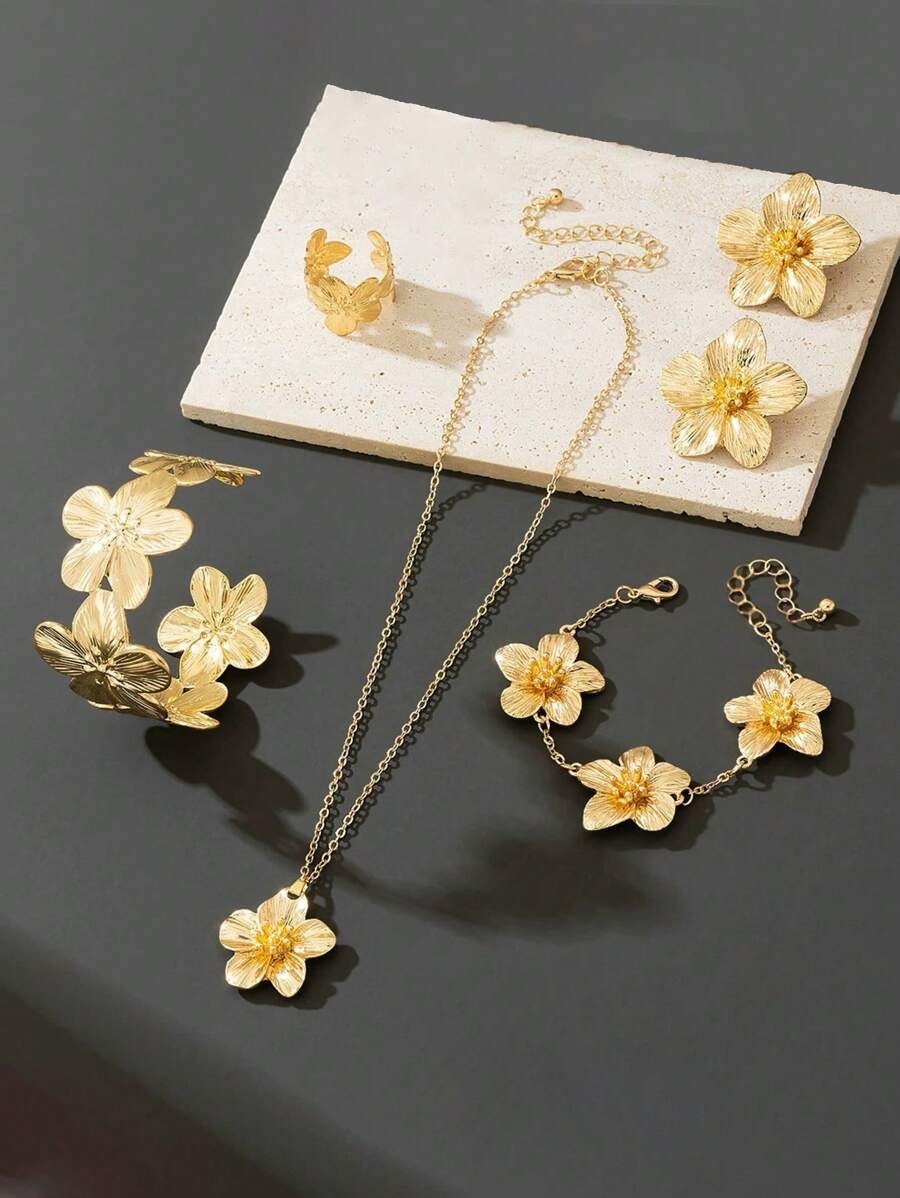 SHEIN طقم 6 قطع مجوهرات زهرة ذهبية وشراشيب