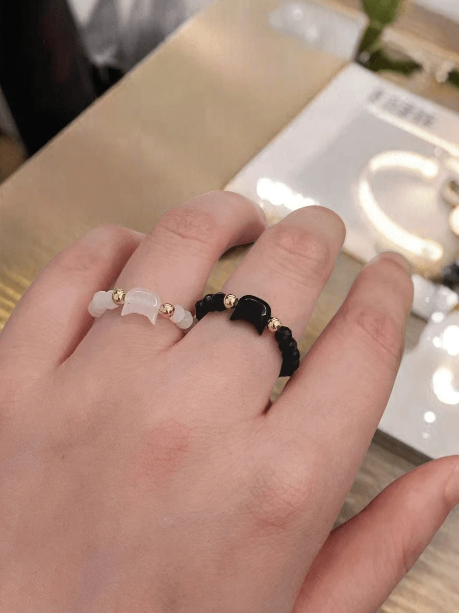 خاتمين مميزين من حجر القمر والأوبسيديان الأسود، بتصميم بسيط وملفت في شكل قطتين وحدة بيضاء ووحدة سوداء. ستايلهم روحي وهادئ، يعكس طاقة التوازن والتركيز. يناسب البنات والأولاد بكل بساطة، خفيفين ومريحين في اللبس.