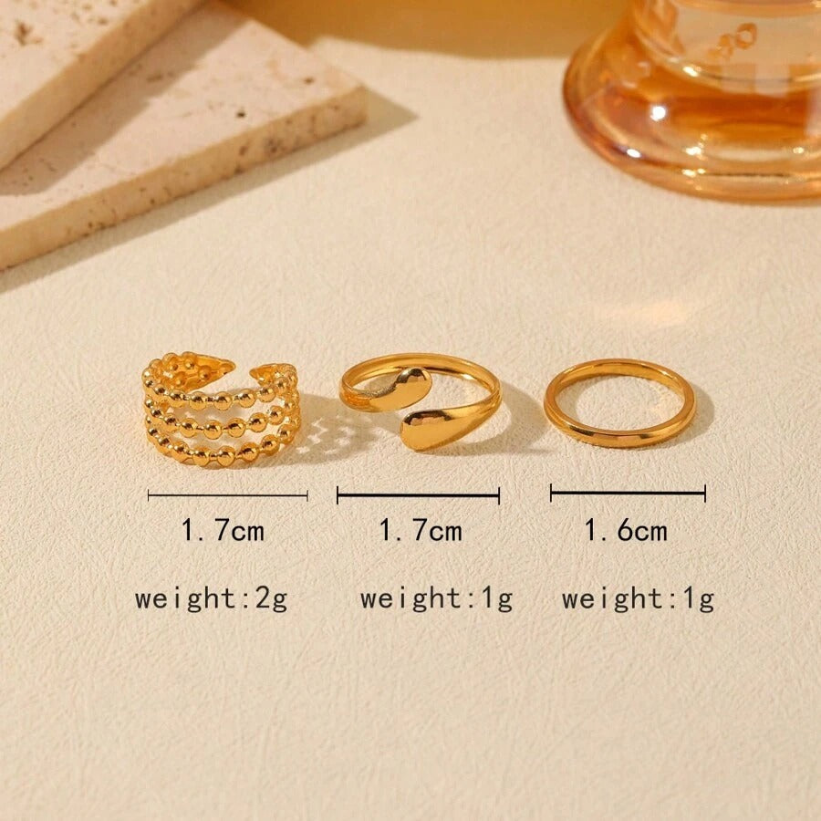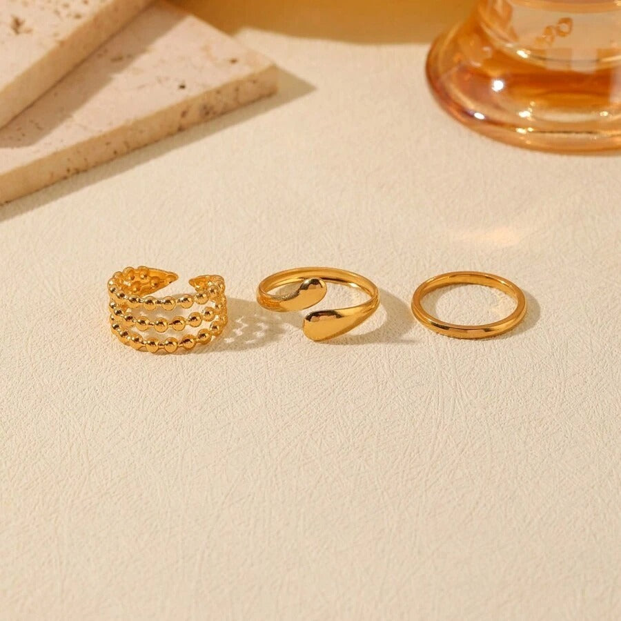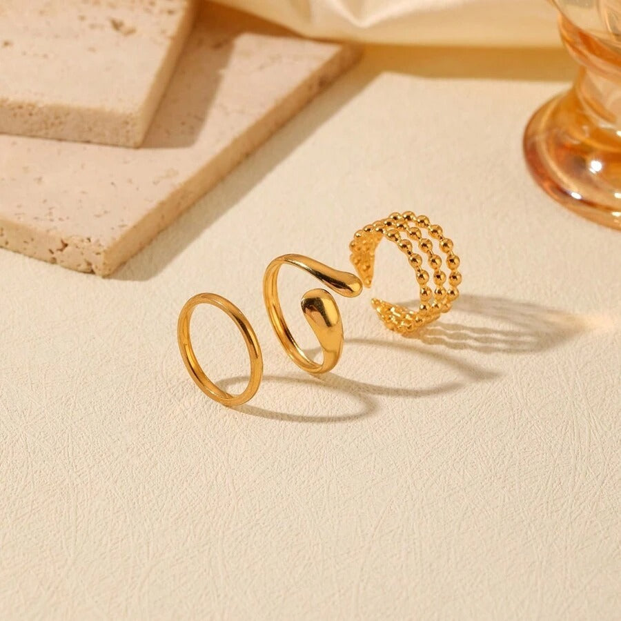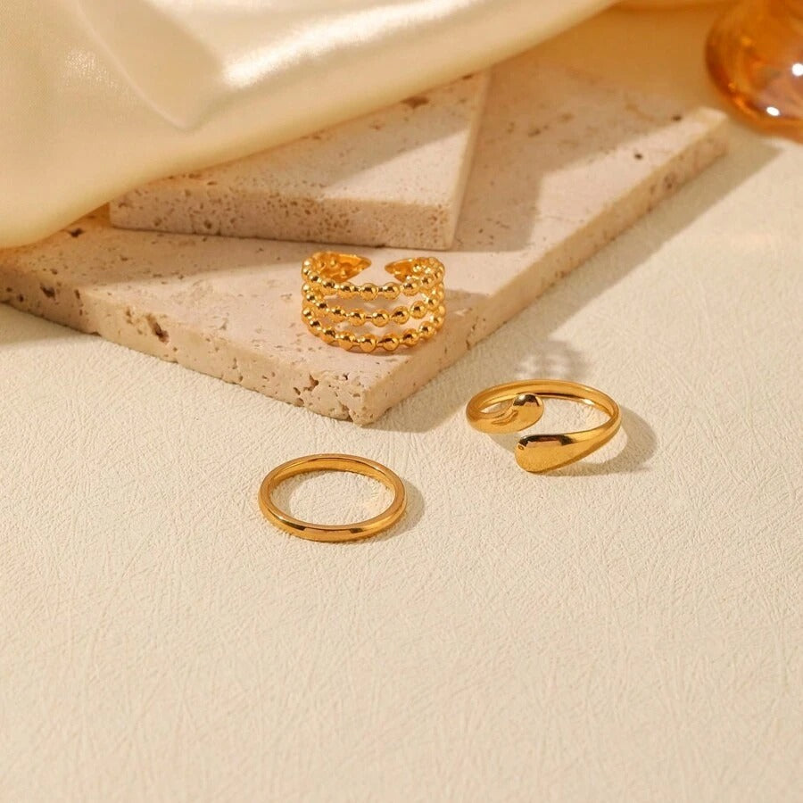 3 خواتم خفيفة من الستانلس ستيل مطلية بالذهب، بتصميم موجة بسيط وعصري. خواتم قابلة للتعديل تناسب كل المقاسات، تضيف لمسة ناعمة وأنيقة لأي إطلالة يومية.