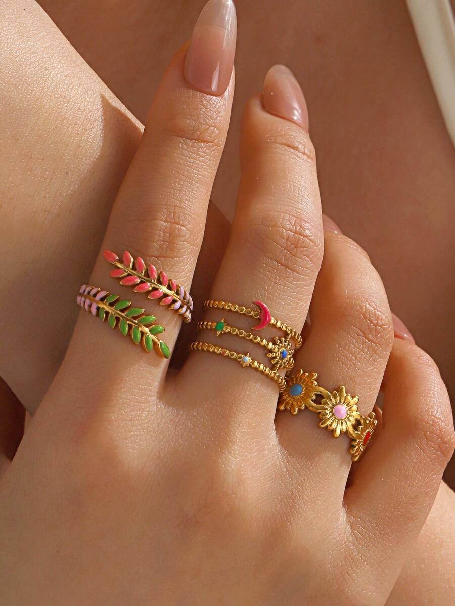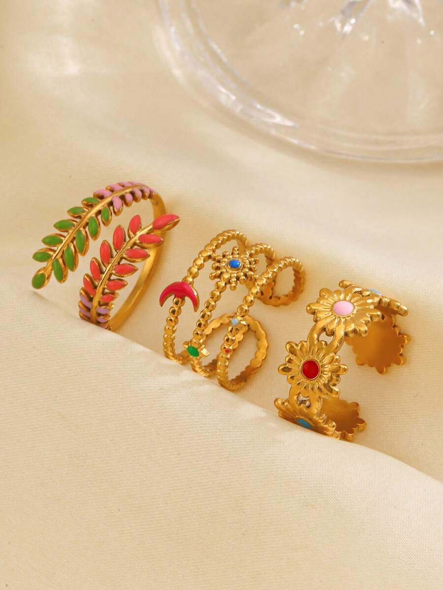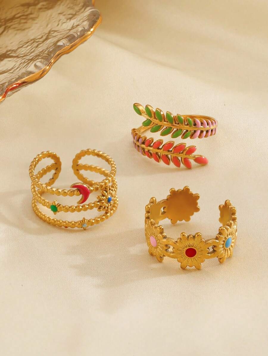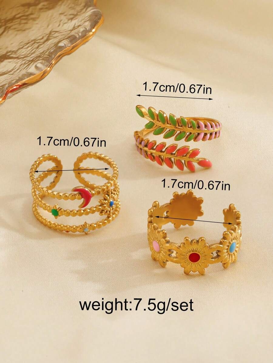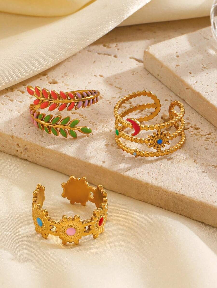طقم 3 خواتم مفتوحة ملونة من ستانلس ستيل – تصاميم زهرة، ورقة، نجمة وقمر 🌸🍃⭐🌙